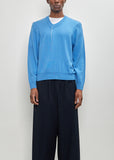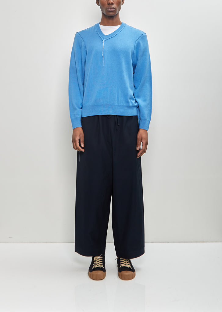 Camiel Fortgens blue off-center V-neck sweater with signature stitched raw edges and loose thread details throughout in merino wool. Features longer back hem and ribbed trim finish at neckline, cuffs, and hem. Boxy fit.