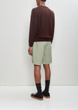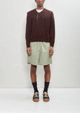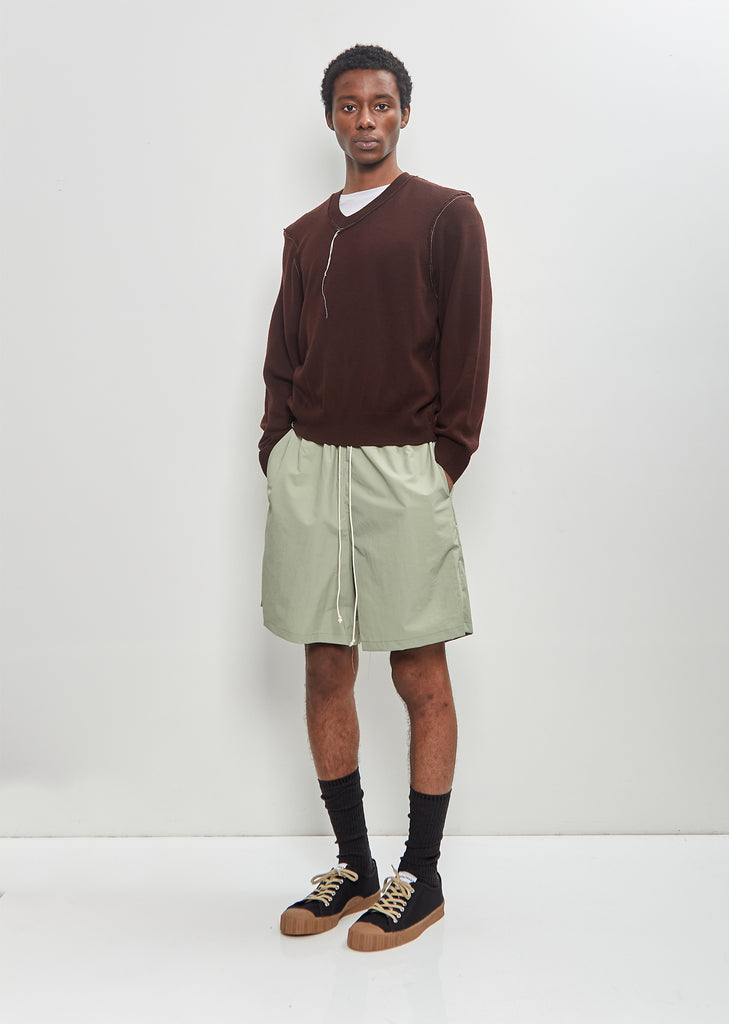 Camiel Fortgens brown off-center v-neck sweater with signature stitched raw edges and loose thread details throughout in merino wool. Features longer back hem and ribbed trim finish at neckline, cuffs, and hem. Boxy fit.