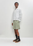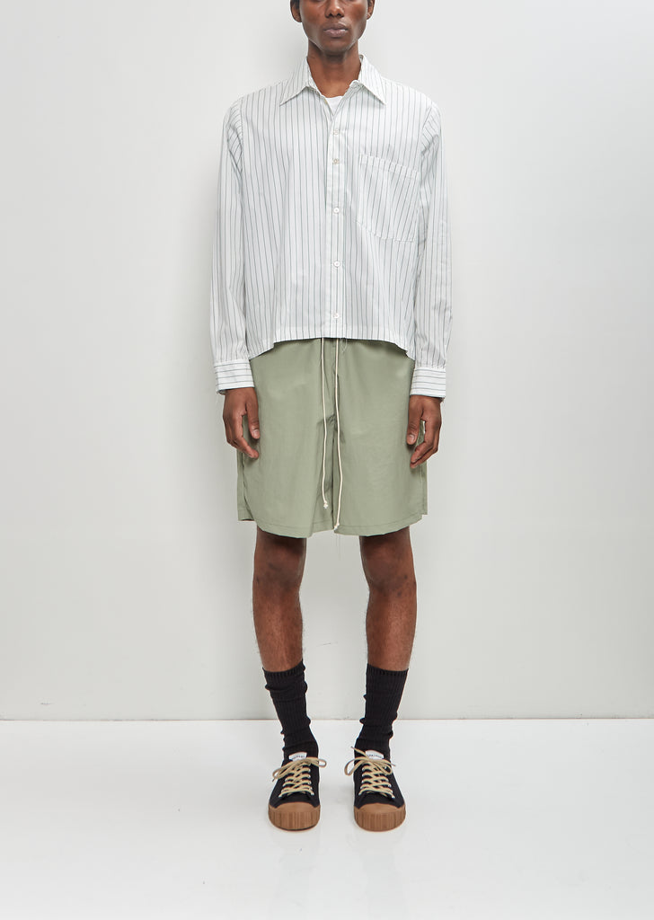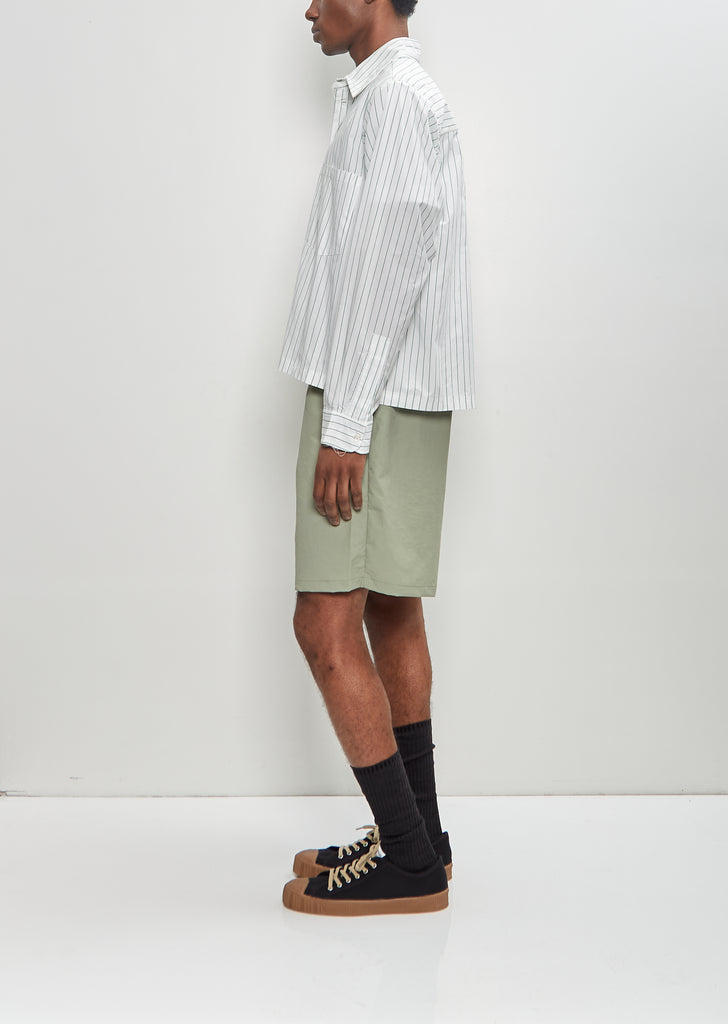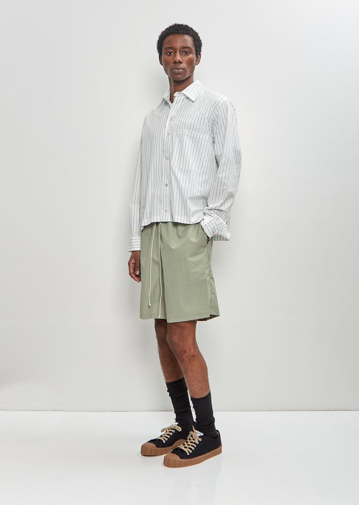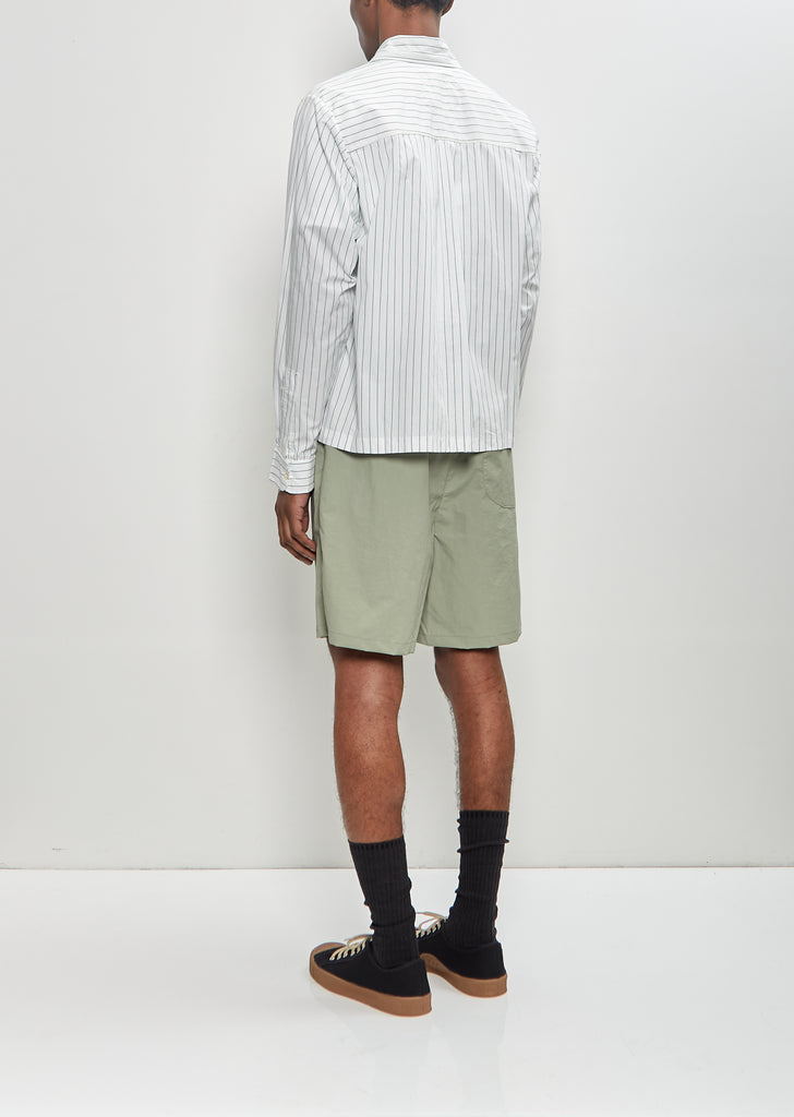Camiel Fortgens off white and green striped shirt with signature loose thread details throughout in cotton. Features a classic collar, chest patch pocket, buttoned cuffs, box pleat at back yoke, and shell-hued button front.