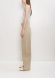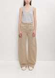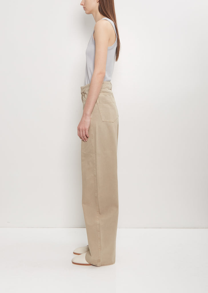 Lemaire signature denim trousers in natural beige with a high waist and shaped wide legs in cotton denim. This clean, flat front pant features a wide waistband, belt loops, and angled side pockets. Buttoned single back pocket. Zipper fly with tab fastening at front. Relaxed fit.