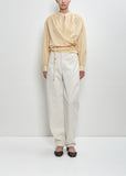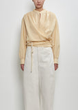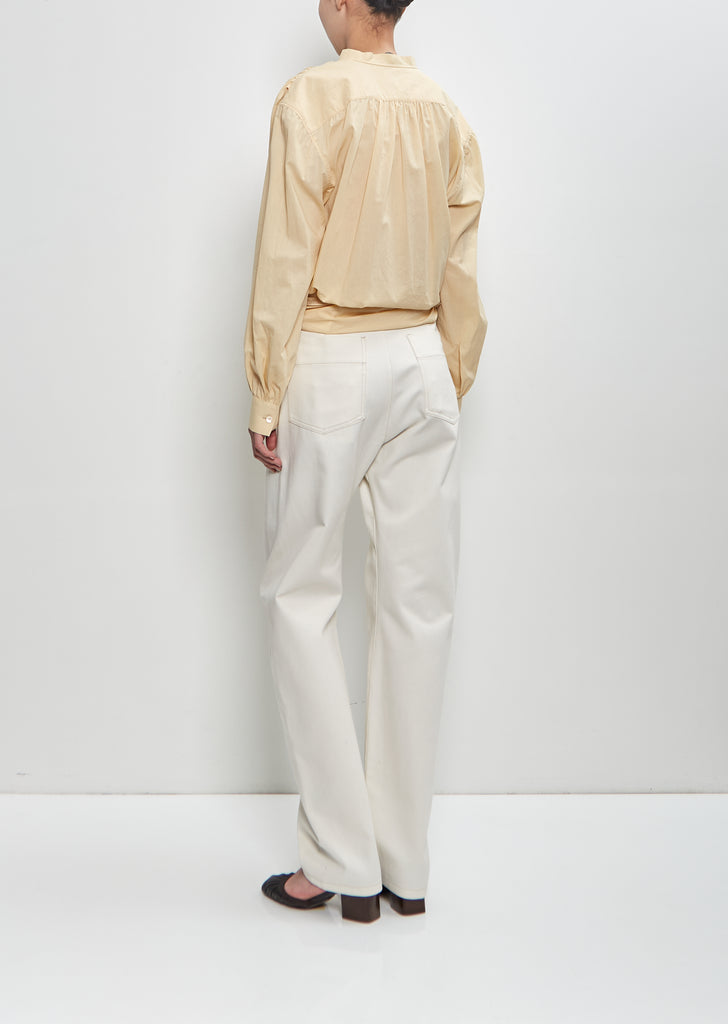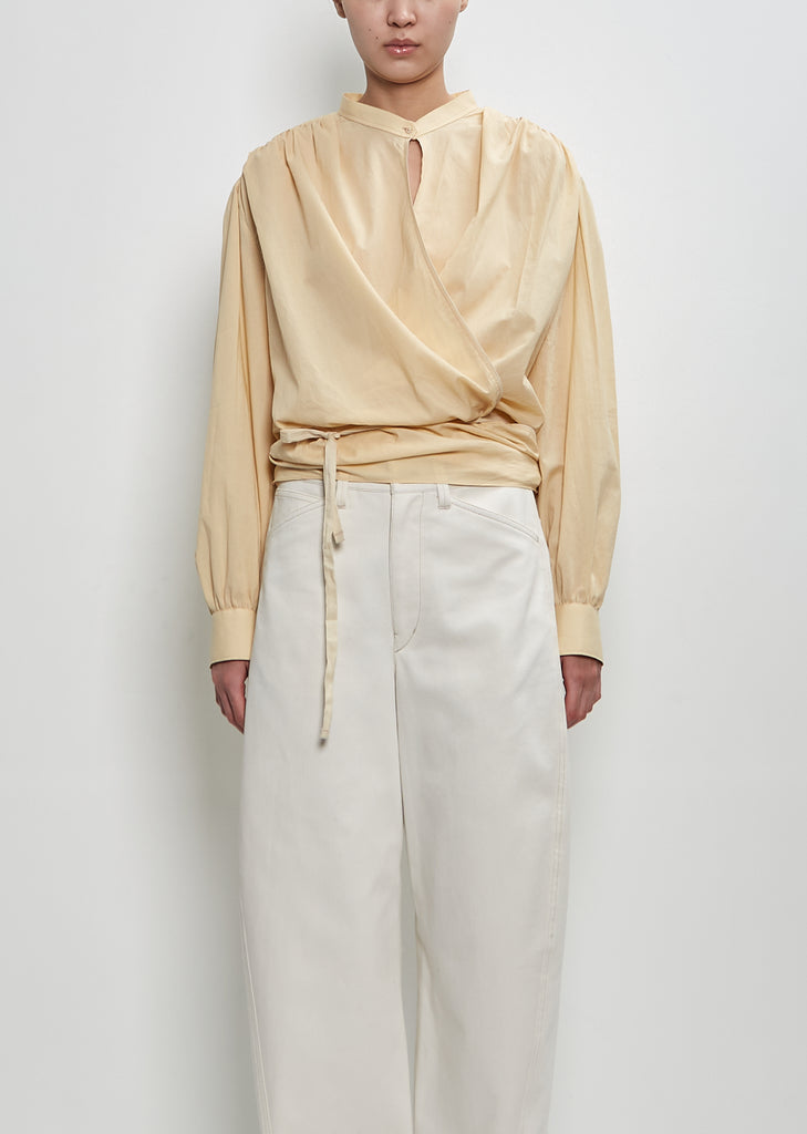 Lemaire light yellow long sleeve blouse with contrasting cotton adjustable tie at waist in lightweight washed cotton poplin with a soft hand and a satin-like texture. Features a narrow band collar, gatherings at shoulders and cuffs, buttoned cuffs, back yoke and a single Mother-of-Pearl button closure at neck.