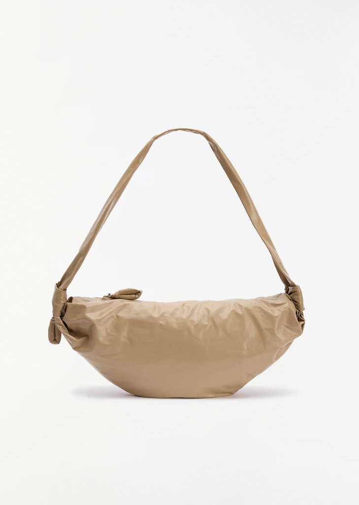 Lemaire new croissant-shaped shoulder and crossbody bag in cumin beige soft lightweight paper leather in the medium size. Featuring a side-knotted strap and a tassel zip-top pull. Silver-tone metal hardware at zip-top closure. Single interior zip pocket and patch pocket. Lined in cotton.