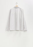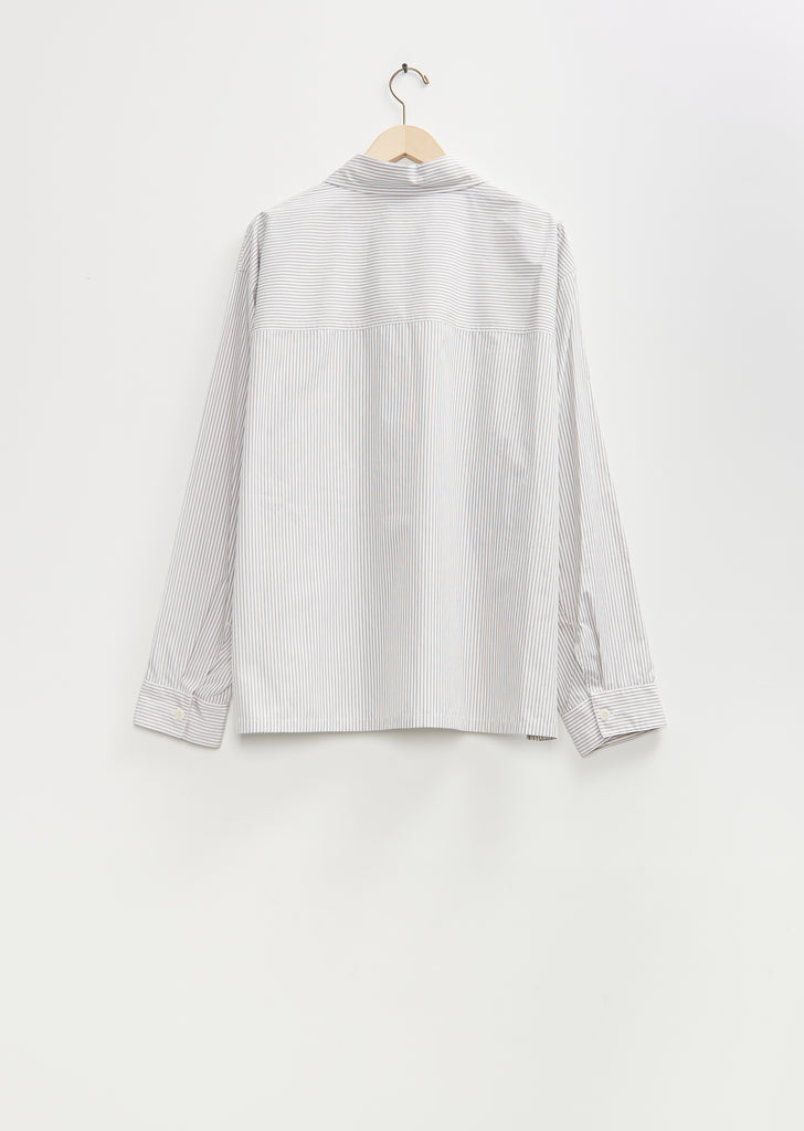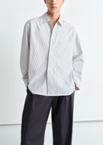Lemaire white, taupe, and black striped shirt with a spread collar and four corozo button closure in cotton poplin. Features dropped shoulders, wide front placket, chest patch pocket, buttoned cuffs, back yoke, and interior hanger loop. Boxy fit.