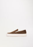 Common Projects brown low top slip on sneakers with elasticated contrasting white panels in suede leather. Fully lined in soft white leather with a leather insole and an off white rubber outsole with a treaded sole. Finished with signature gold foil style numbers on outer heel.