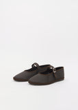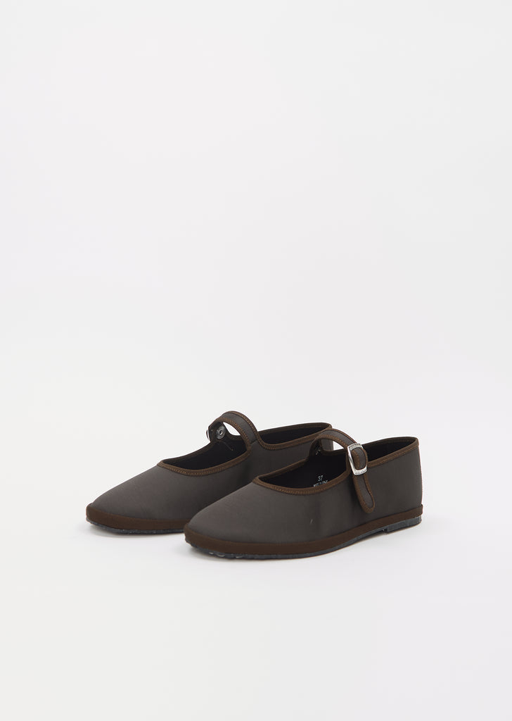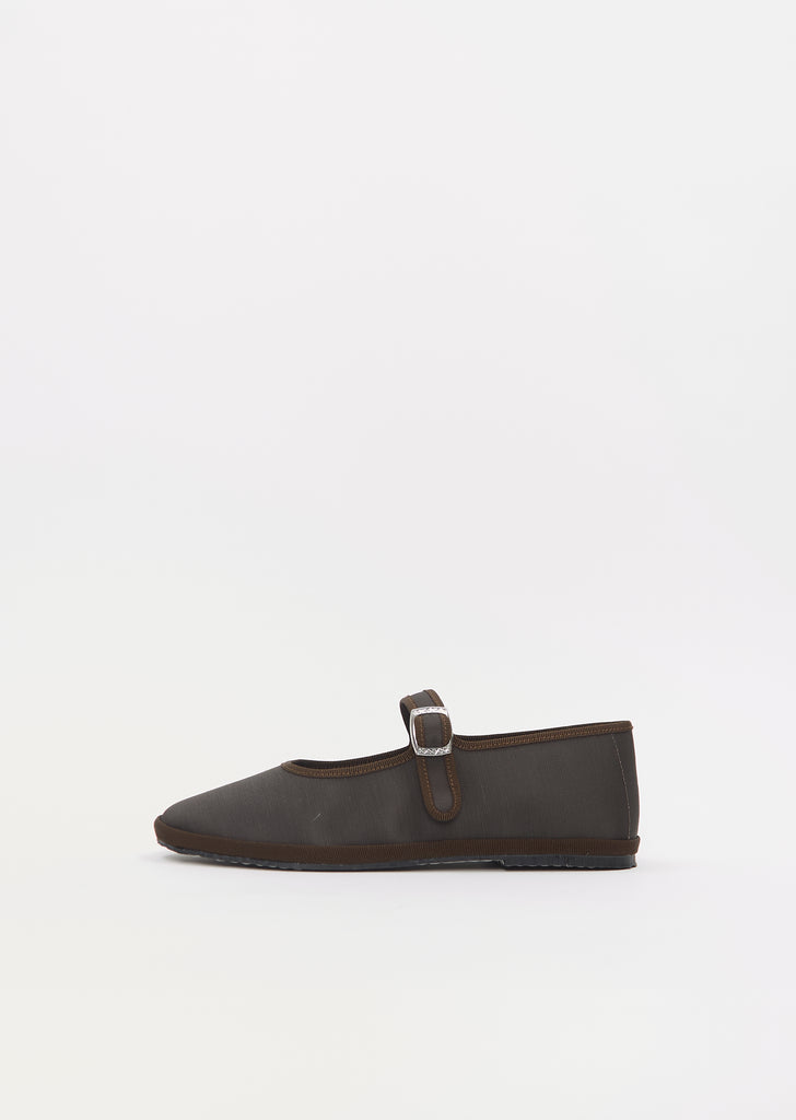 La Garçonne x Drogheria Crivellini Exclusive brown mary jane with a faux polished silver buckle and snap fastened strap closure in moire. Features a sustainably constructed rubber sole made from recycled bicycle tires with contrasting white stitching. Finished with tonal grosgrain trims.