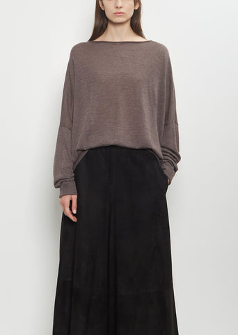 Dušan taupe relaxed sweater with a boat neck with rolled edge finish in airy and lightweight cashmere knit. Features 3/4 dolman sleeves, dropped shoulders and rib trim finishings at cuffs and hem.