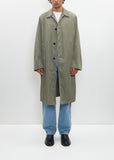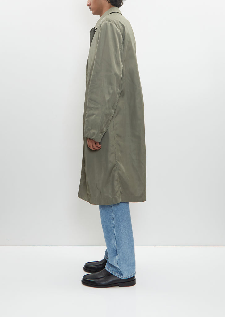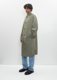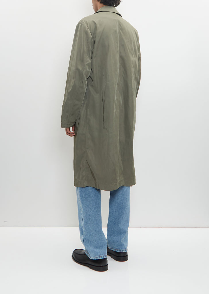 Dries Van Noten khaki coat with spread collar and black horn-hued button front in water repellant fabric. Features set-in shoulders, side welt pockets, vent at back, and an interior buttoned welt pocket. Straight silhouette with relaxed fit. Fully lined in self.