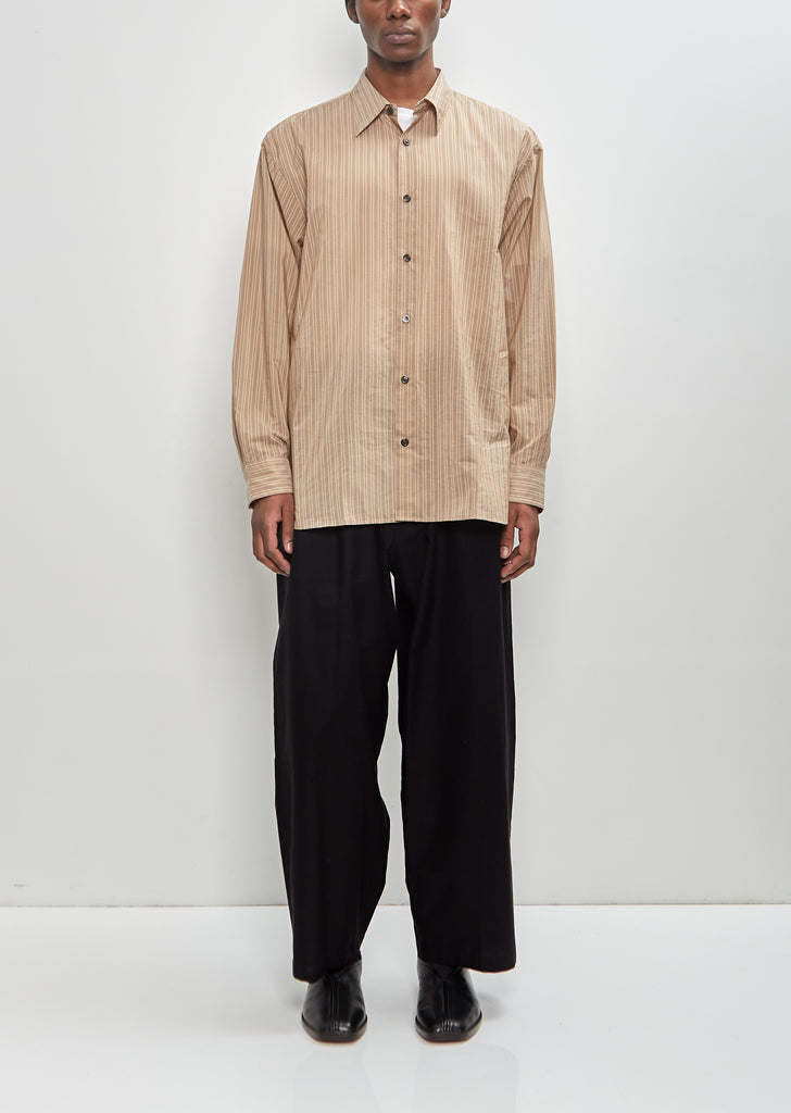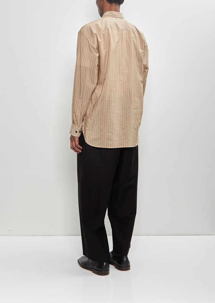 Dries Van Noten sand beige and light purple striped shirt with spread collar and button front in cotton cupro blend. Features buttoned cuffs, curved split side hems, slightly elongated shirttail and back yoke. Straight silhouette with a regular fit.