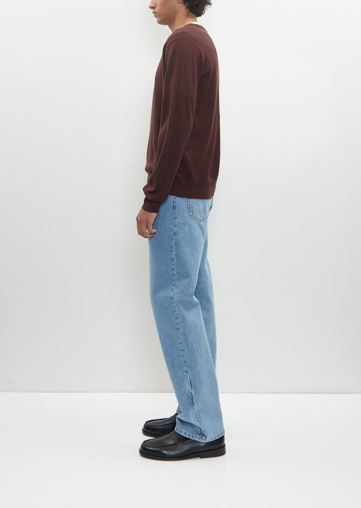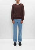 Dries Van Noten brown sweater with wide round neck in merino wool knit. Features set-in shoulders and ribbed trim finishings at neckline, cuffs, and hem. Relaxed fit.