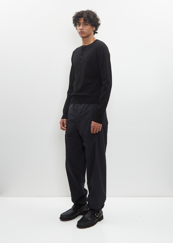 Dries Van Noten black henley sweater with five tonal buttons closure at front in soft and lightweight cotton knit. Features a round neck, set-in shoulders and ribbed trim finishings at neckline, placket, cuffs, and hem.