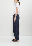 Dries Van Noten indigo blue pull-on straight leg pants with elasticated drawstring waist and cuffs in lightweight cotton denim. Features belt loops, angled side pockets, a single patch pocket at back, and button and zip-fly fastening.