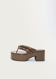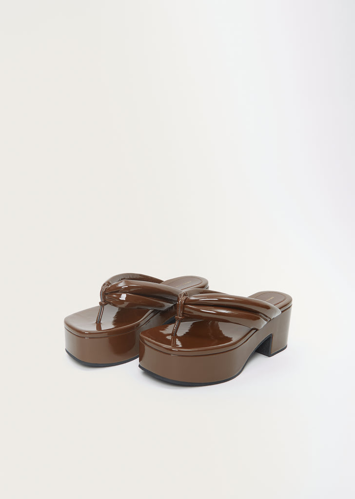 Dries Van Noten dark brown platform sandal with padded round straps in patent leather. Fully lined in tonal leather and set on a tonal leather covered square heel.