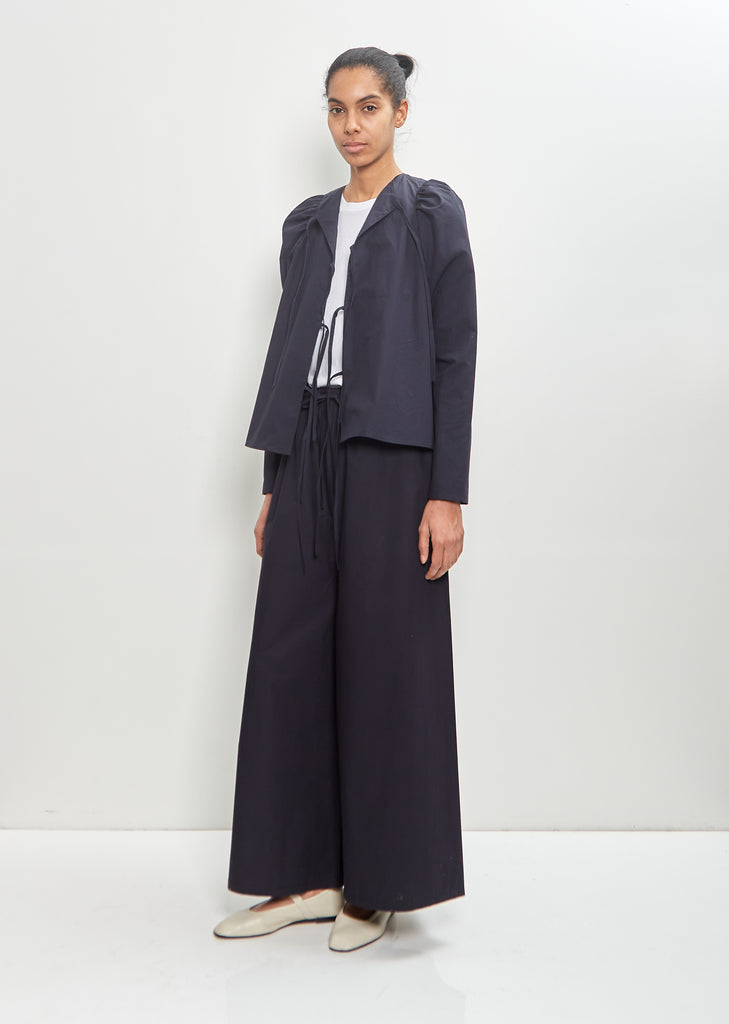 Eleph navy shirt with a round neck and slight puffed long sleeves in crisp cotton. Features gathered shoulders and an open front with four self ties fastening at front.