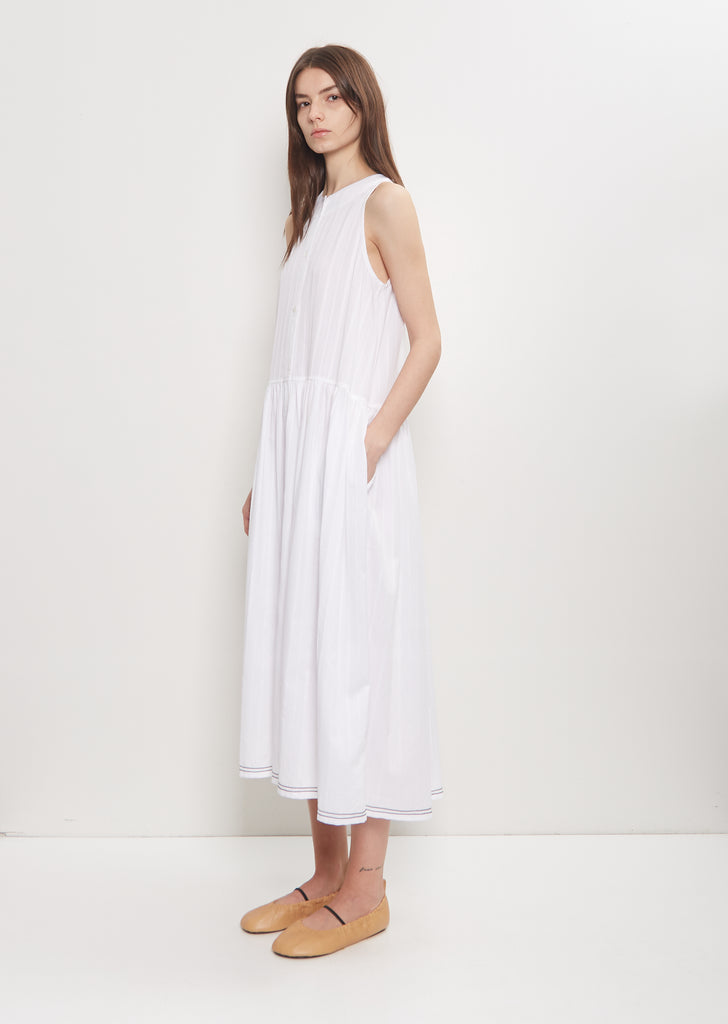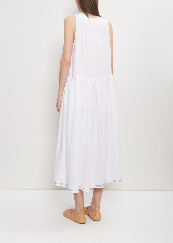 Eleph white A-line dress with a gathered skirt and contrasting stitch detail at bottom hem in soft cotton with a stripes pattern. Features a round neckline, concealed side seam pockets and a shell-hued buttons closure at front. Comes unlined. Regular fit.
