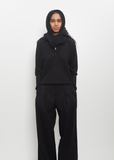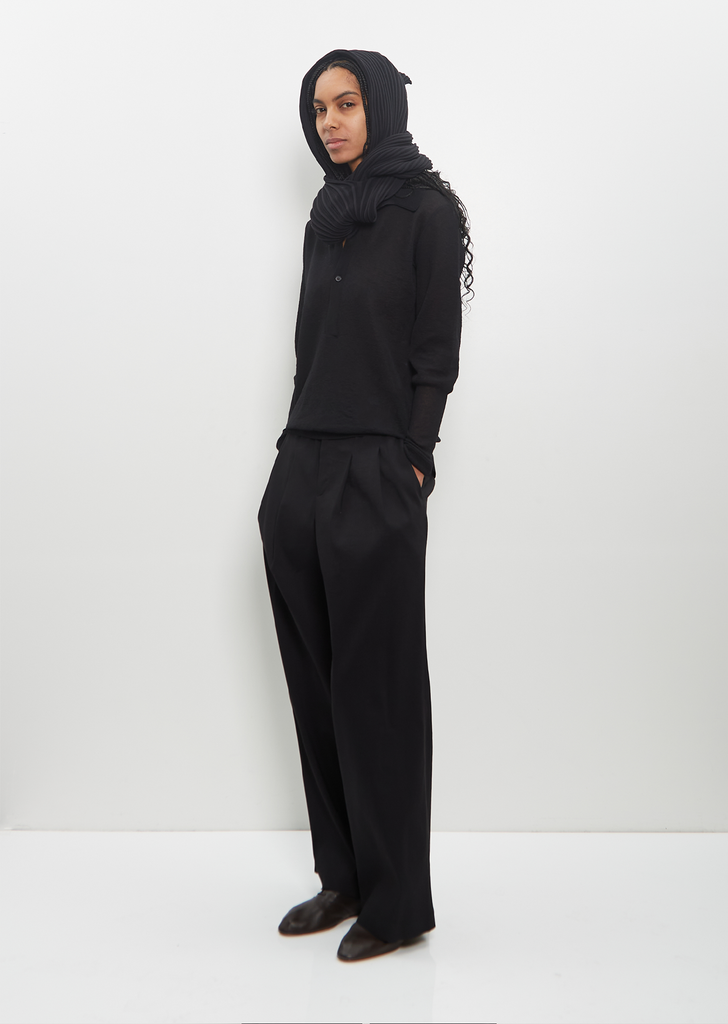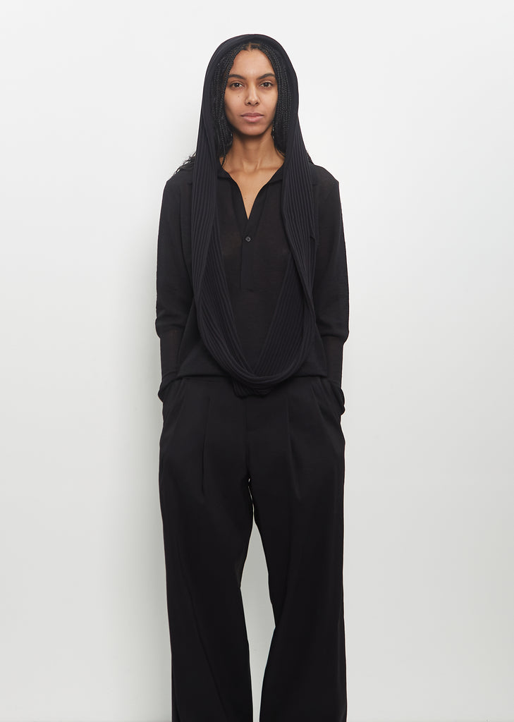 Issey Miyake black seamless stole in pleated poly-cotton knit. Can be worn wrapped around neck or head.