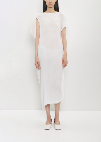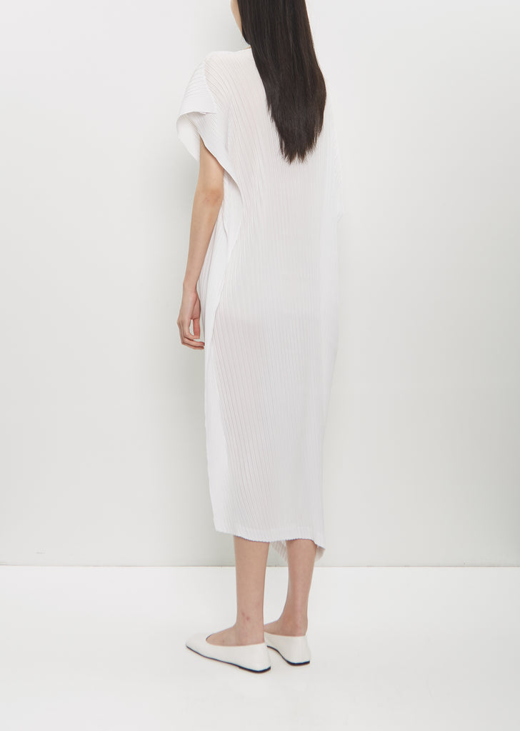 Issey Miyake white pullover dress with asymmetrical draping details at shoulders and single short sleeve in pleated polyester crêpe de Chine. Features a boat neckline and an asymmetrical hem. Relaxed fit.