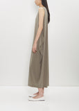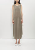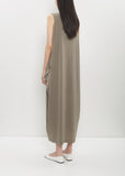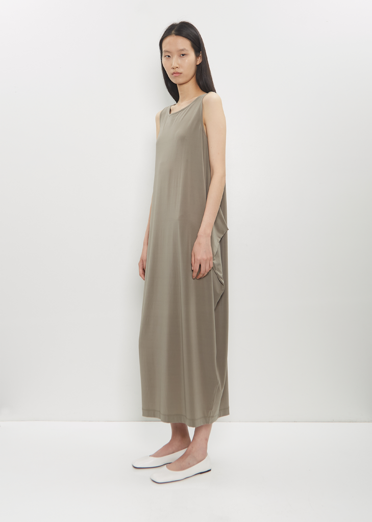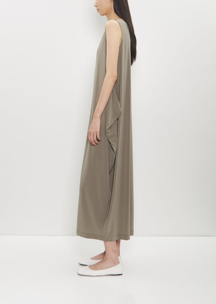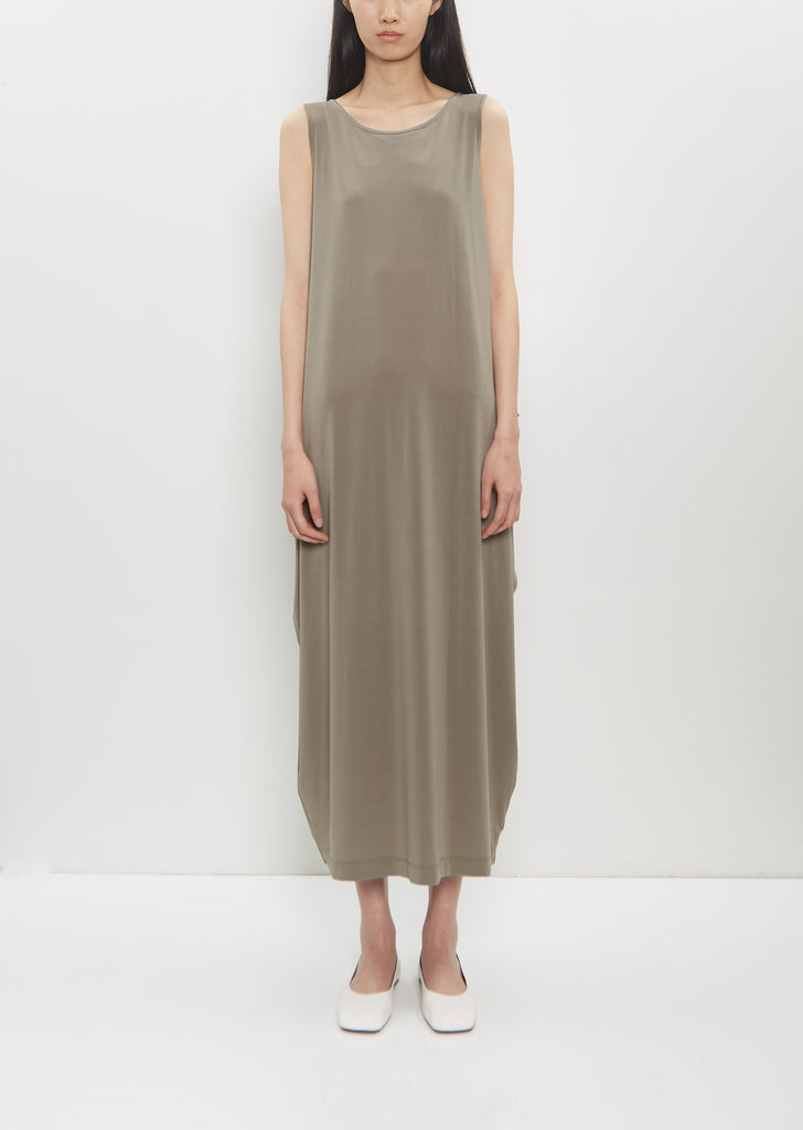 Issey Miyake greige sleeveless pullover dress with draped details at side seams in soft and fluid jersey. Features a round neckline and straight hem. Relaxed fit.