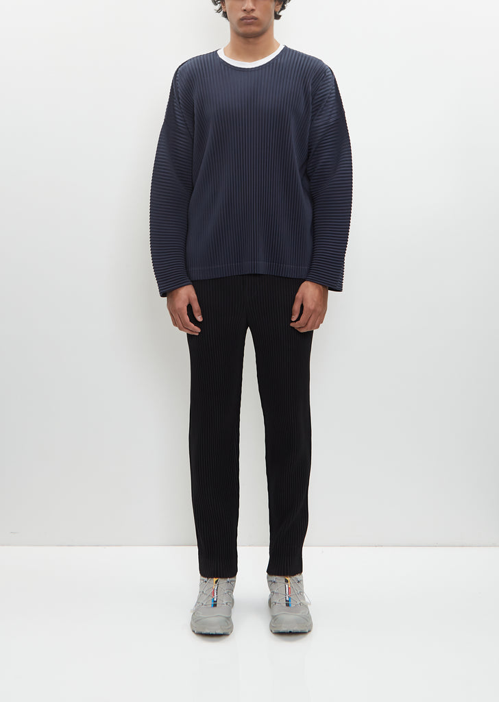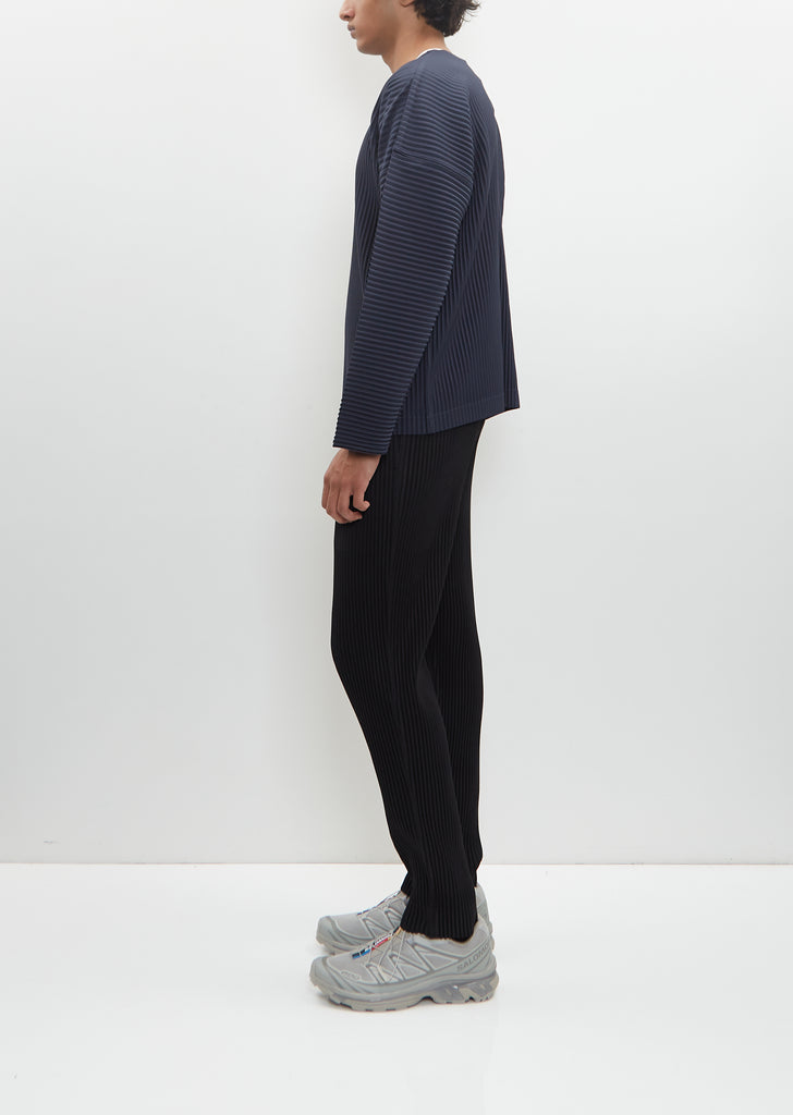 Homme Plissé Issey Miyake black trousers tailored trousers with a closer fit in pleated mid-weight wool-like textured poly fabric. Features elasticated waist, belt loops, side seam pockets, and concealed button closure.