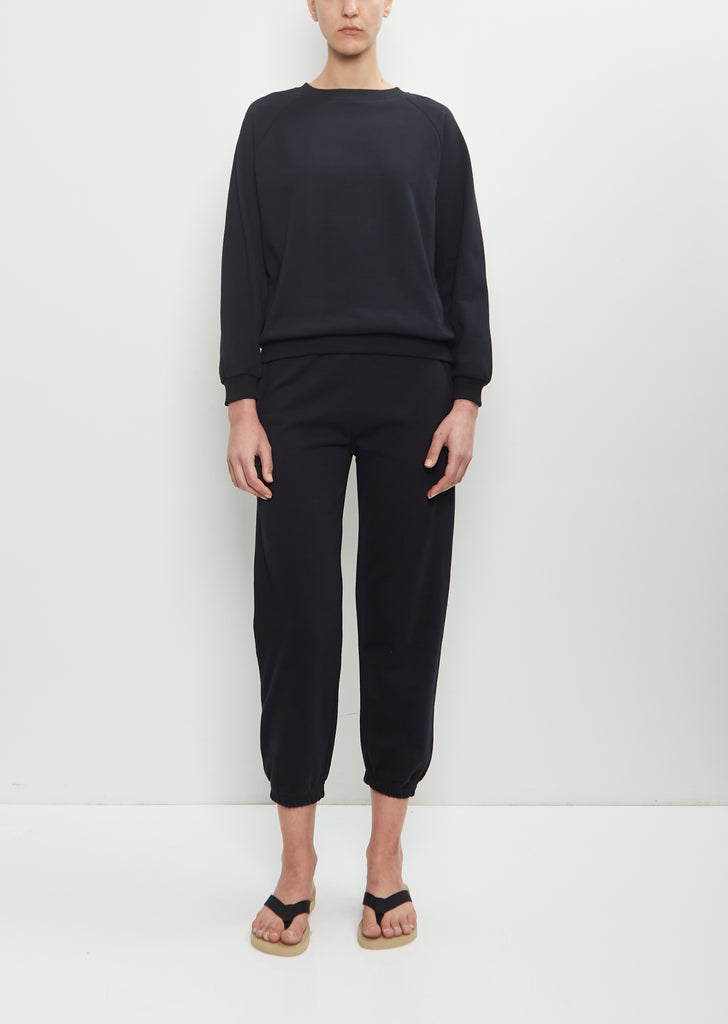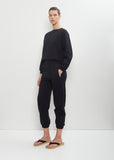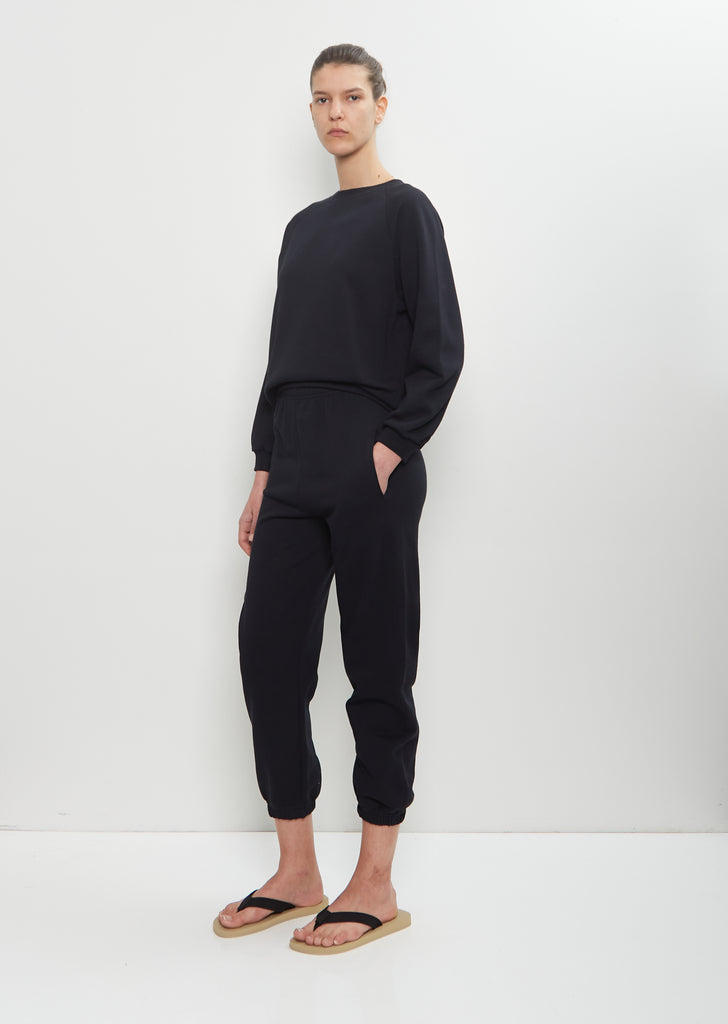 Signature, elevated pull-on sweatpant with a mid-rise and slightly tapered at knee in faded black Japanese ultra-soft cotton fleece, designed with a cropped silhouette and seamless sides for a polished look. Features slip pockets and a gathered elasticized waistband and cuffs. Cropped at mid-calf with an easy fit.