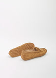 Le Monde Béryl taupe driver moccasin with bow detail in soft water-resistant suede leather. Features a cushioned calf leather insole and rubber pebble sole.