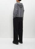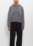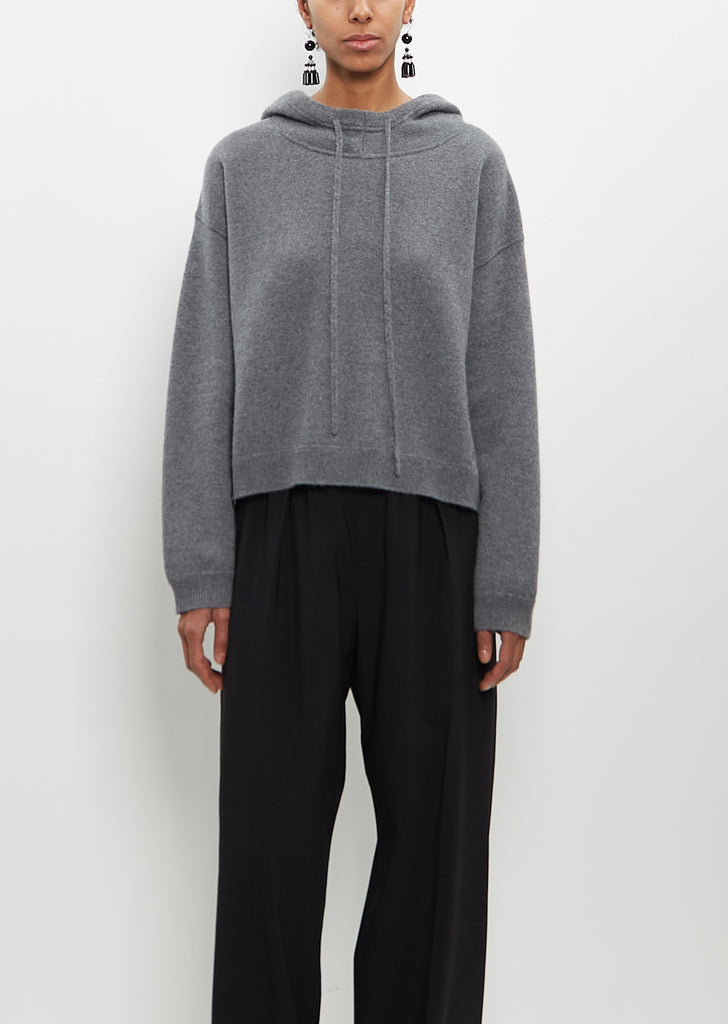 Loulou Studio slate grey hoodie with a slightly high neck and an adjustable drawstring hood in tight knit cashmere terry. Features ribbed trim finish at neck, hood, cuffs, and hem. Finished at the hem with the brand’s signature seashell-logo embroidery. Relaxed fit.
