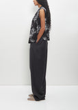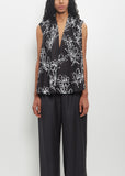 Loulou de Saison black sleeveless top with V-neckline and a stand collar at back in embroidered silk with a flower motif. Features gathered overlay front, curved side split hem, and hook and eye zip closure at side seam.