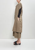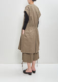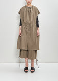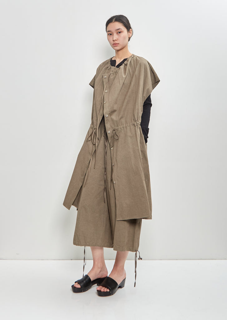 Lauren Manoogian khaki long vest with adjustable drawstrings at neckline and waist for an optional gathered effect in soft hand-dyed Pima cotton with sun-dried effect. Features elongated shoulders, side seam pockets, high slit at back hem and horn-hued buttons closure at front.