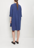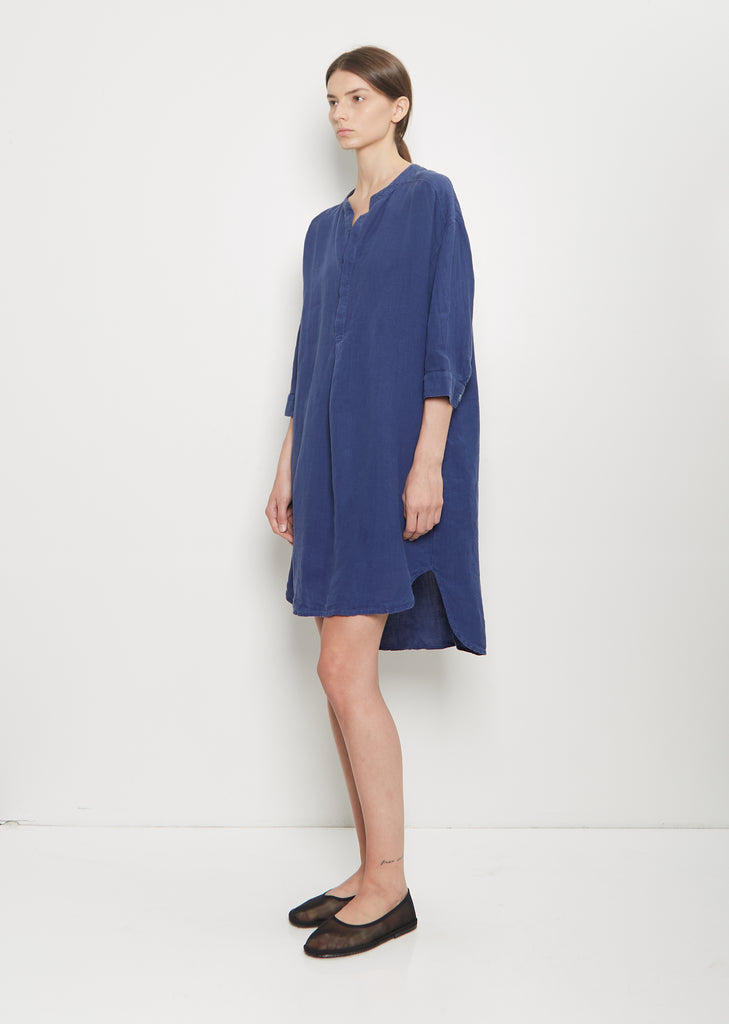 Linge Particulier night blue nightgown inspired by your grandfather's shirt in washed pure linen. Features a concealed buttoned Tunisian collar, dropped shoulders, elbow-length sleeves, buttoned cuffs, box pleat at back yoke, and rounded hem with an elongated back. Loose fit. Designed to be worn indoors or outdoors, depending on the season.