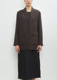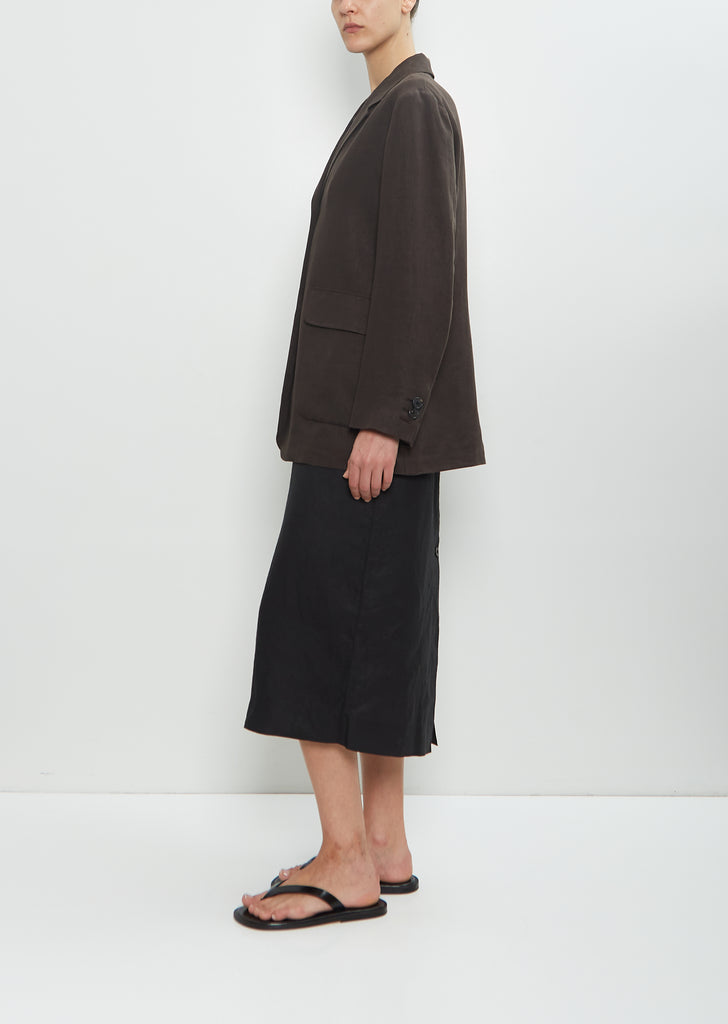 Margaret Howell dark brown single breasted tailored blazer with a notched collar and two black buttons closure in a lightweight linen plainweave. Features front flap patch pockets, buttoned cuffs, interior welt pocket, and vent at back. Half lined in a black cotton fabric. Relaxed fit.