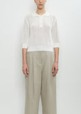 Margaret Howell ecru polo shirt with a three mother-of-pearl button closure in a lightweight and soft cotton cashmere blend open knit. Features a spread collar, elbow length sleeves, ribbed trim finish at collar, cuffs, and hem, and solid seam detailing throughout. Relaxed fit.
