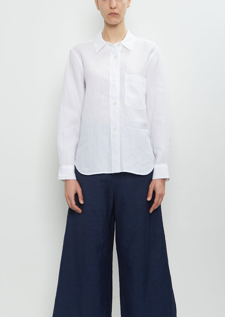 Margaret Howell white shirt with a regular collar and mother-of-pearl button front in a crisp linen woven in Ireland. Features a single chest patch pocket, a raised placket, buttoned cuffs, curved hem, and hanger loop detail at back yoke. Finished with mother-of-pearl buttons. Regular fit.