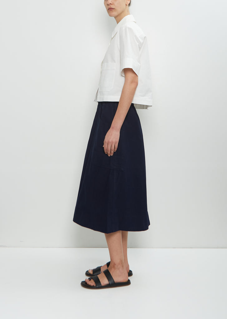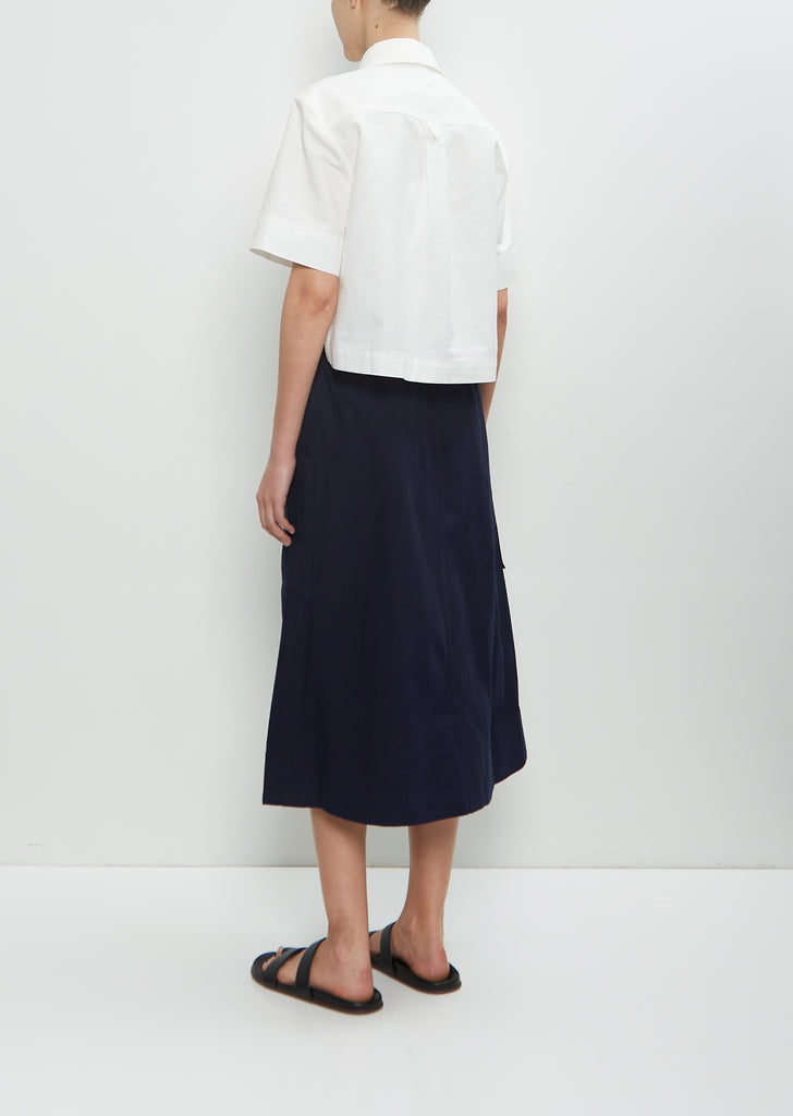 MHL by Margaret Howell off white cropped short sleeve shirt with a classic collar and front patch pockets in a Japanese panama weave cotton. Features a raised placket with tonal button closure, split side hems, and hanger loop detail and box pleat at back yoke. Boxy fit.