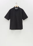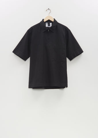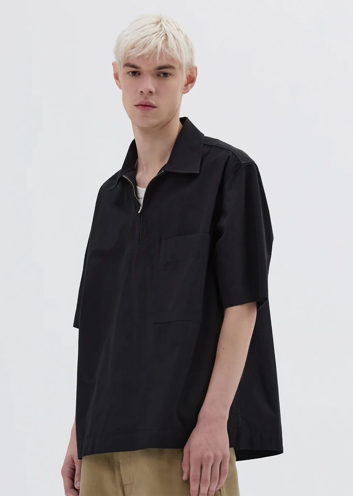 MHL by Margaret Howell black short sleeve shirt with a spread collar and 3/4 zip in Japanese panama weave cotton. Features dropped shoulders, a deep chest patch pocket, split side hems, and a large box pleat at back yoke.