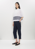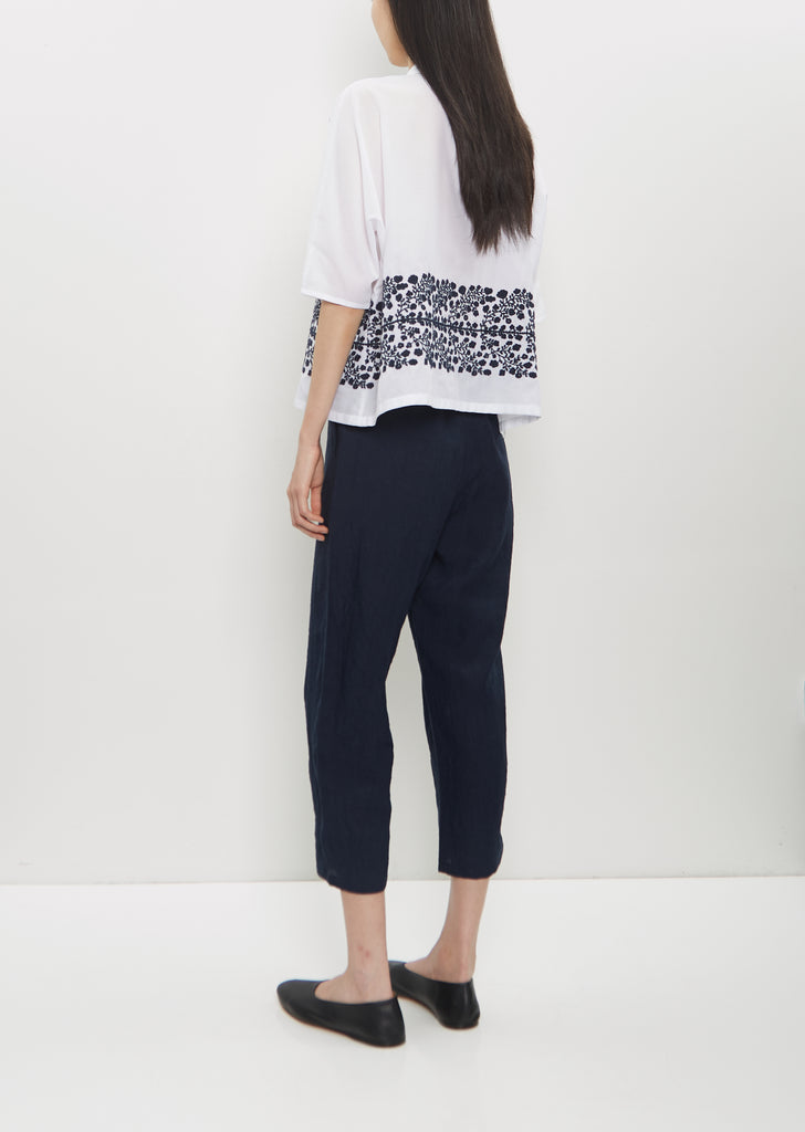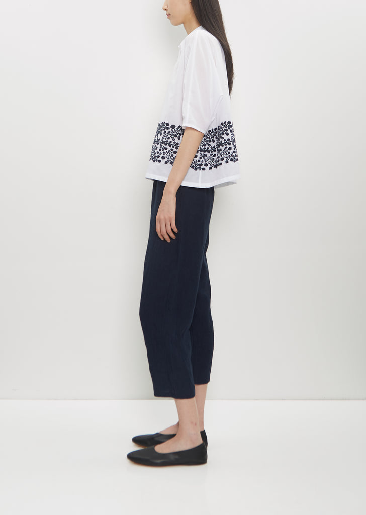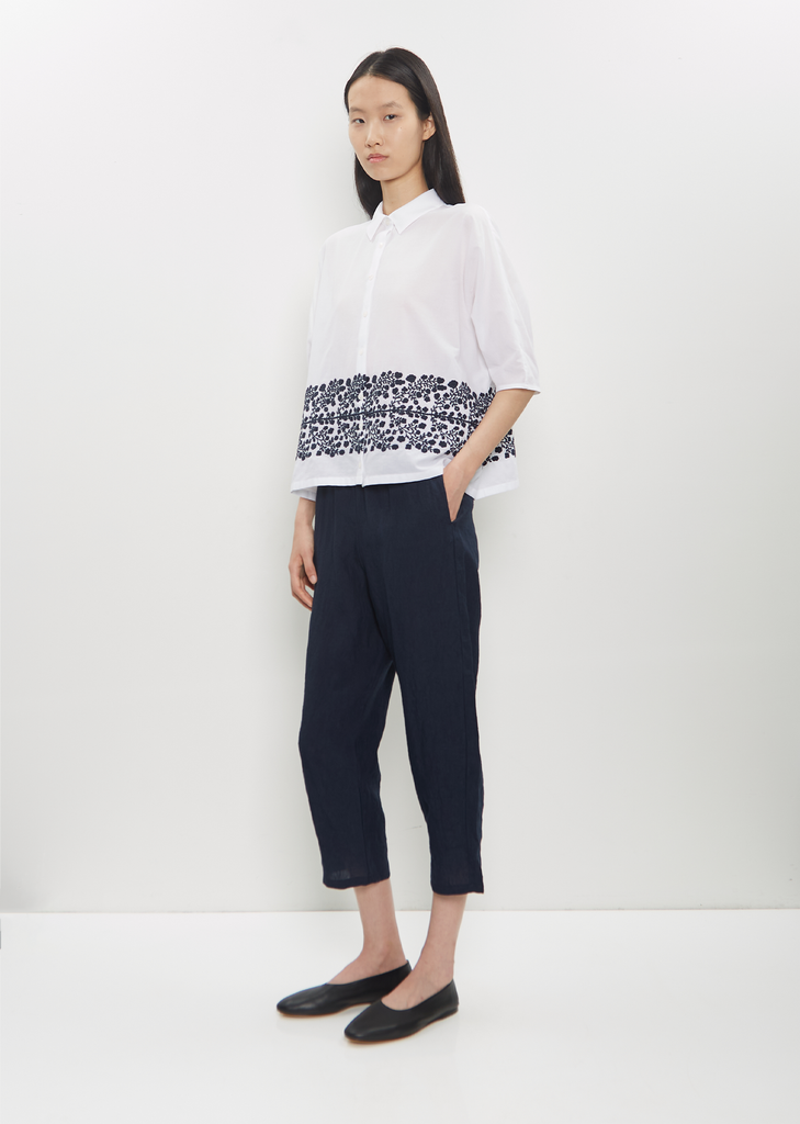 Minä Perhonen white blouse with a classic collar and a navy embroidered floral panel in lightweight plain-weave cotton. Features dolman short sleeves and mother-of-pearl button closure at front. Boxy fit.