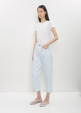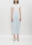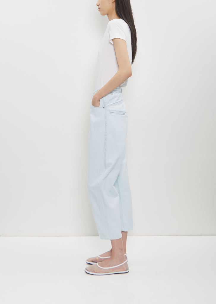 Minä Perhonen light blue tapered jeans with cropped legs in washed cotton and linen denim. Features belt loops, chain stitch detailing at sides, 5-pocket construction, and button fly fastening. Finished with branded buttons.