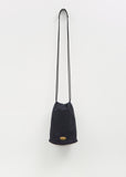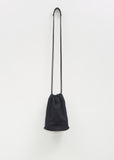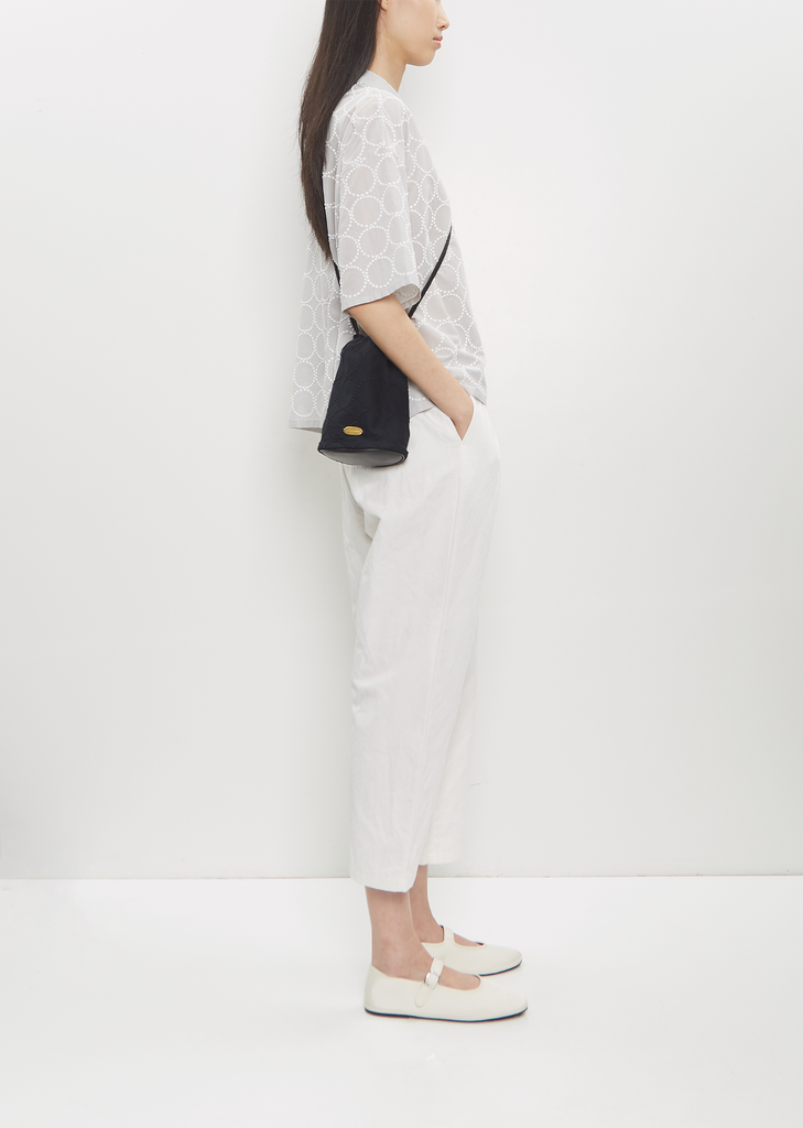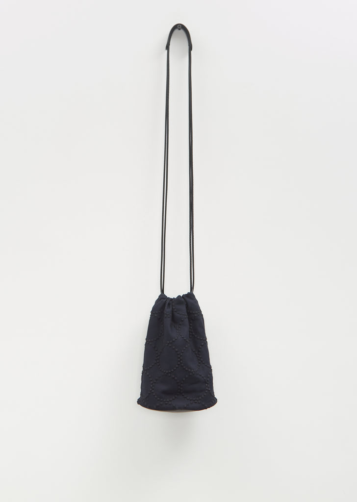 Minä Perhonen dark navy pochette with adjustable drawstring opening in signature tambourine embroidered cotton. Features a double shoulder strap with leader pad, a branded gold-toned label, an interior slip pocket, and a black structured leather bottom. Lined in black suede.