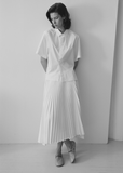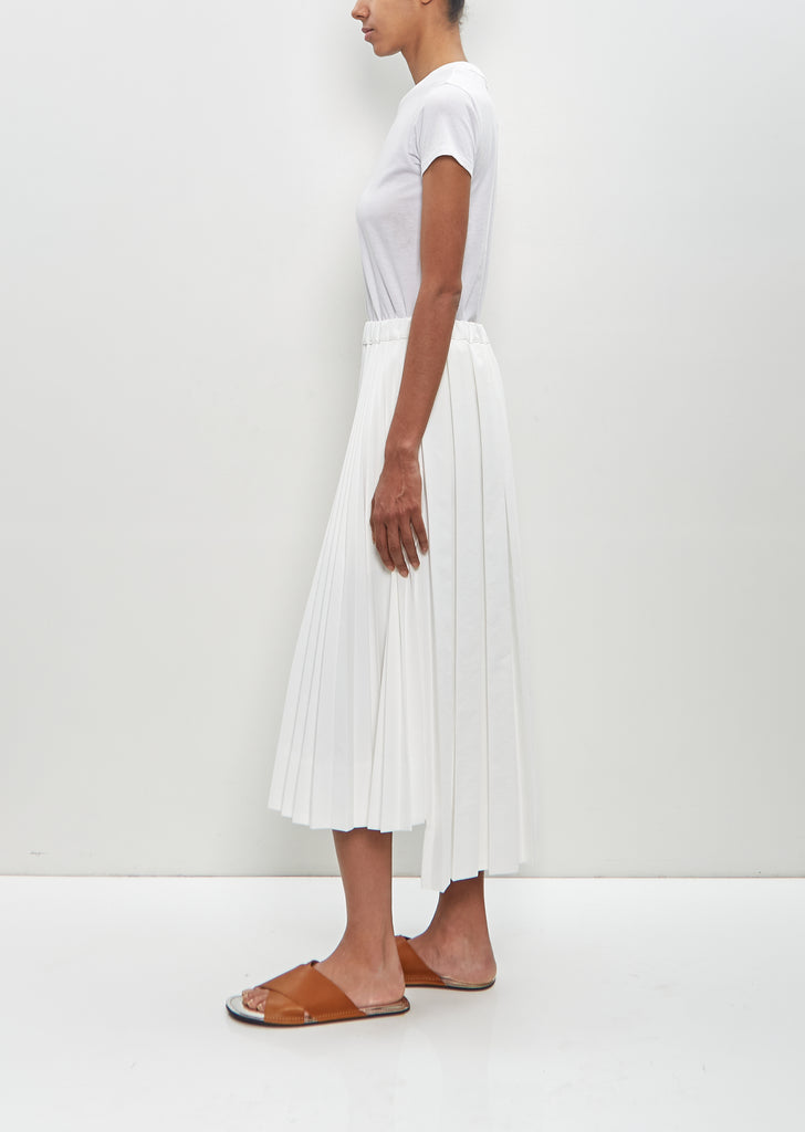 Plan C chalk white pull-on pleated skirt with an asymmetrical hem in polyester, cotton and linen blend. Features an elasticated waistband and side seam pockets.