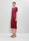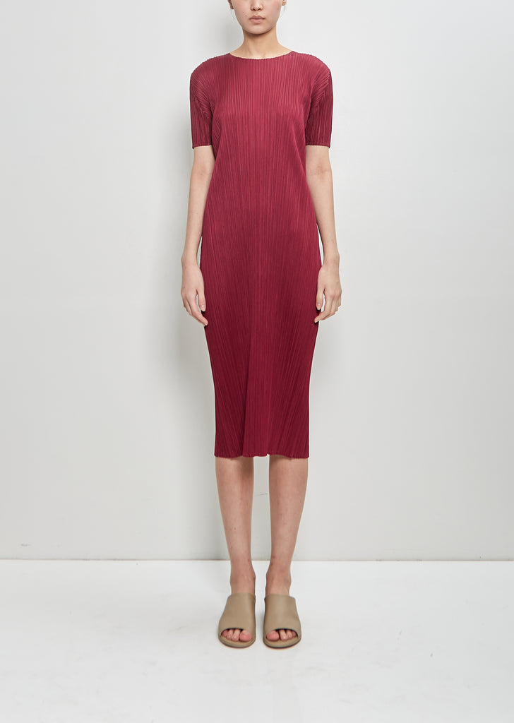 Pleats Please by Issey Miyake burgundy short sleeve dress with a round neckline and dropped shoulders in signature pleated technical chiffon. Closer fit.