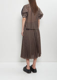 Sacai navy short sleeve tee with a brown check spun organza panel at back in soft cotton jersey. Features a round neck at front, a chest patch pocket, puff sleeves with buttoned cuffs, elongated back hem, stand collar at back, and box pleat at back yoke.
