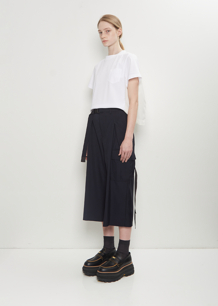 Sacai navy cropped utility pants with an adjustable self belt with a silver-toned rectangular ring in a lightweight wool blend twill. Features belt loops, front pleats, press button flap pockets, grosgrain ribbon attachments, press button flap pockets at back, and button and zip-fly fastening.