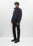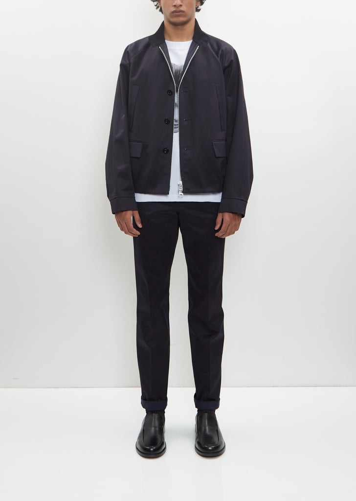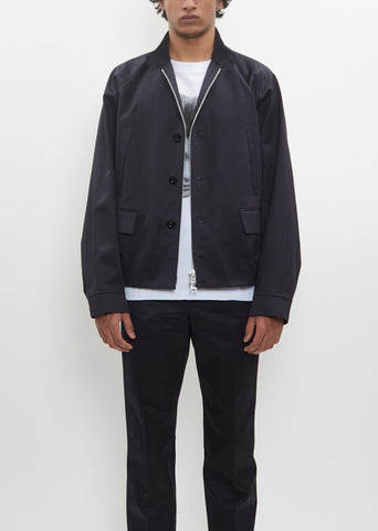 Sacai navy jacket with optional double zip or tonal button front closure in cotton satin. Features stand collar, two button closure at neck, front vertical welt pockets, front flap pockets, buttoned cuffs, and elasticated waist at sides and back. Lined in striped cupro fabric.