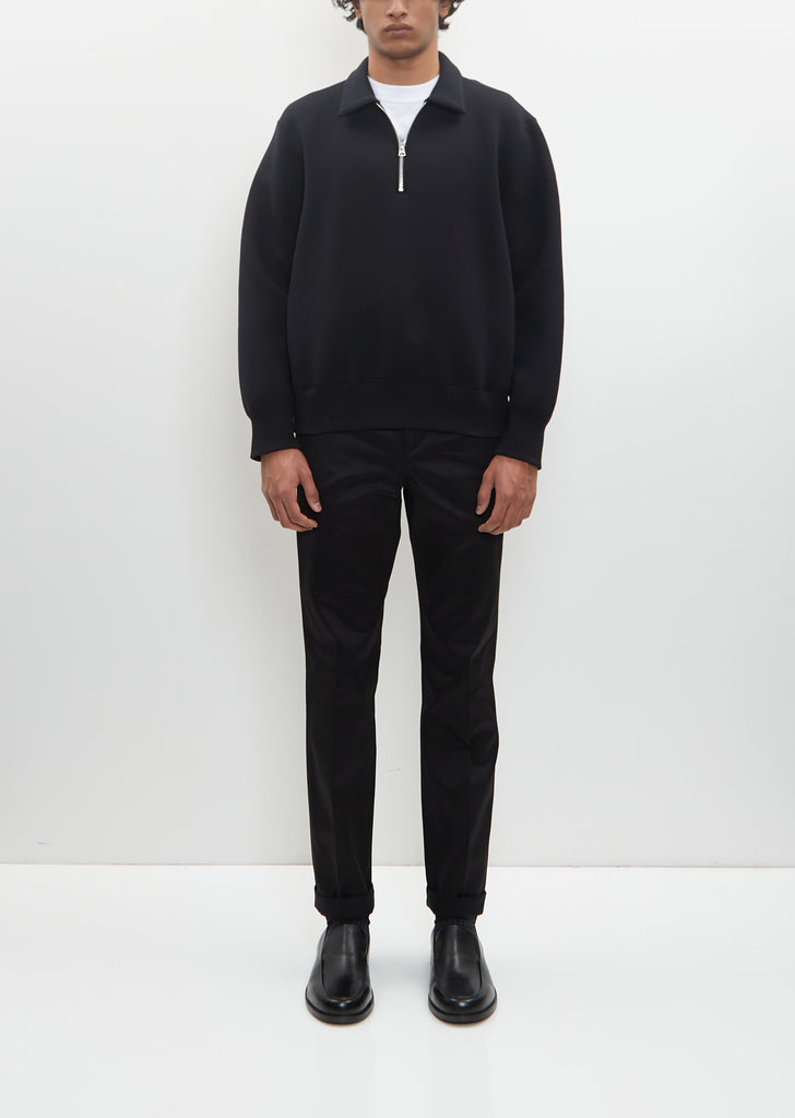 Sacai black sweatshirt with polo collar and three-quarter zip in signature sponge cotton. Features side seam pockets and ribbed trim finish at cuffs and hem.