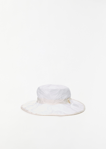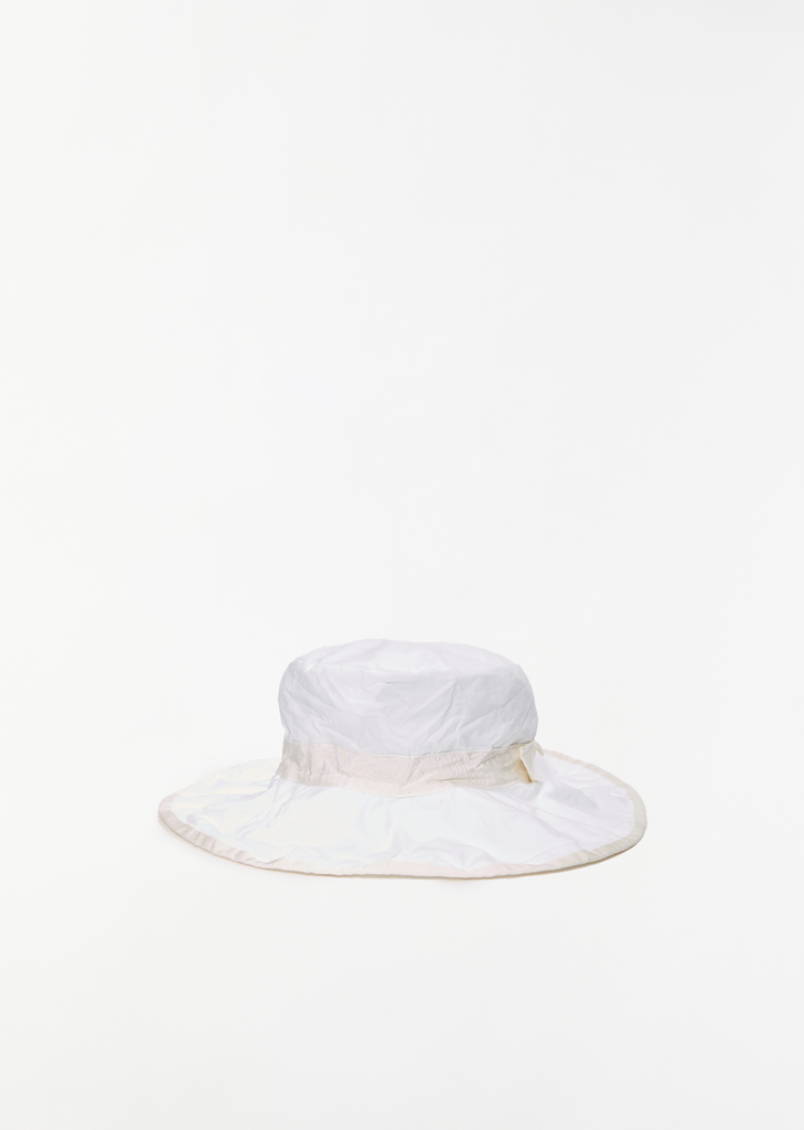 SCHA white wide brimmed hat with ecru grosgrain ribbon trimming in soft cotton with a crinkled effect.