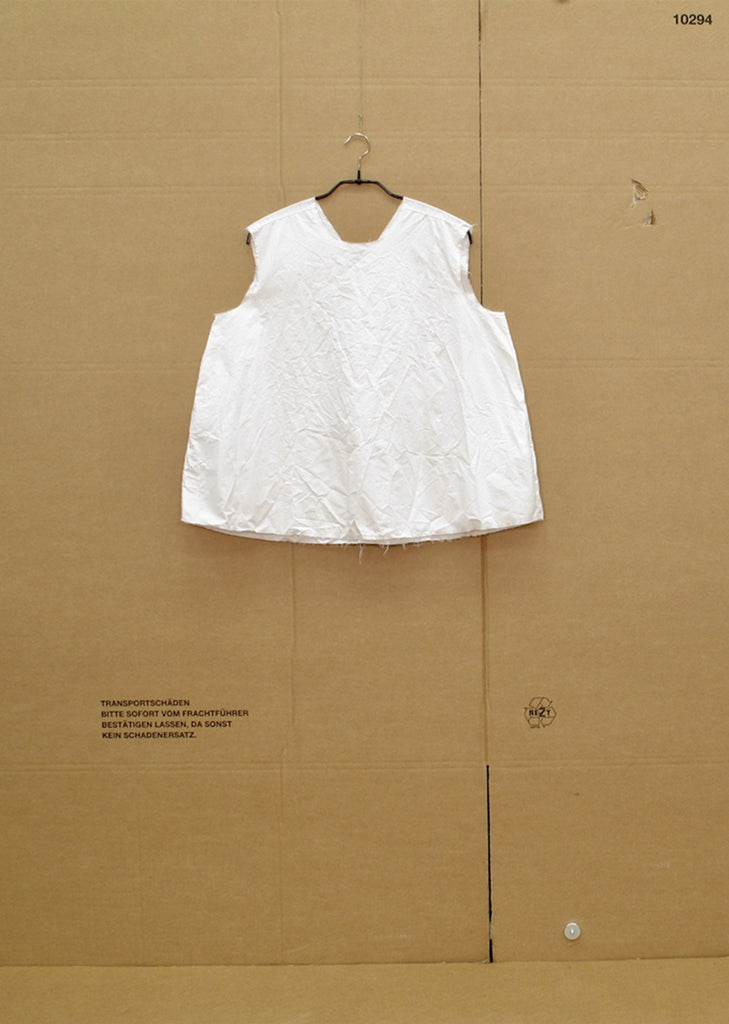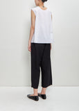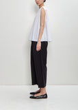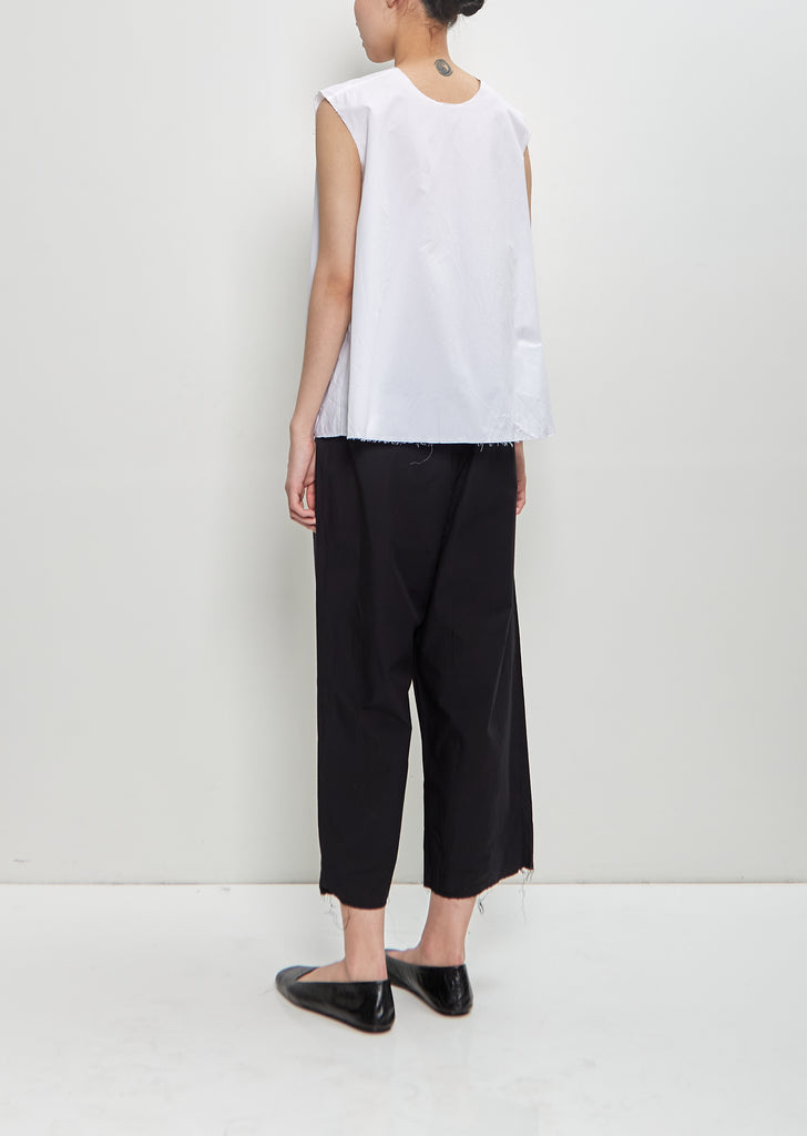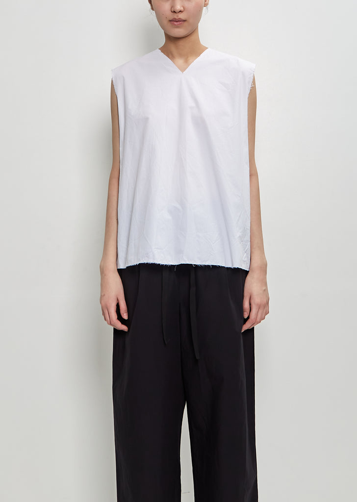 SCHA white sleeveless popover top with a high V-neckline in washed paper cotton. Features round neckline at back and stitched raw edge trim finishings at neckline, armhole and hems. Can also be worn back to front.