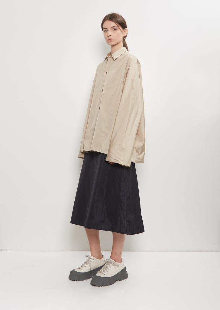 Sofie D'Hoore desert beige long sleeve shirt with a classic collar and side seam pockets in a lightweight technical twill. Features dolman sleeves and mother-of-pearl buttons closure at front. Boxy fit.