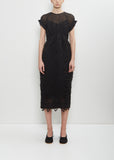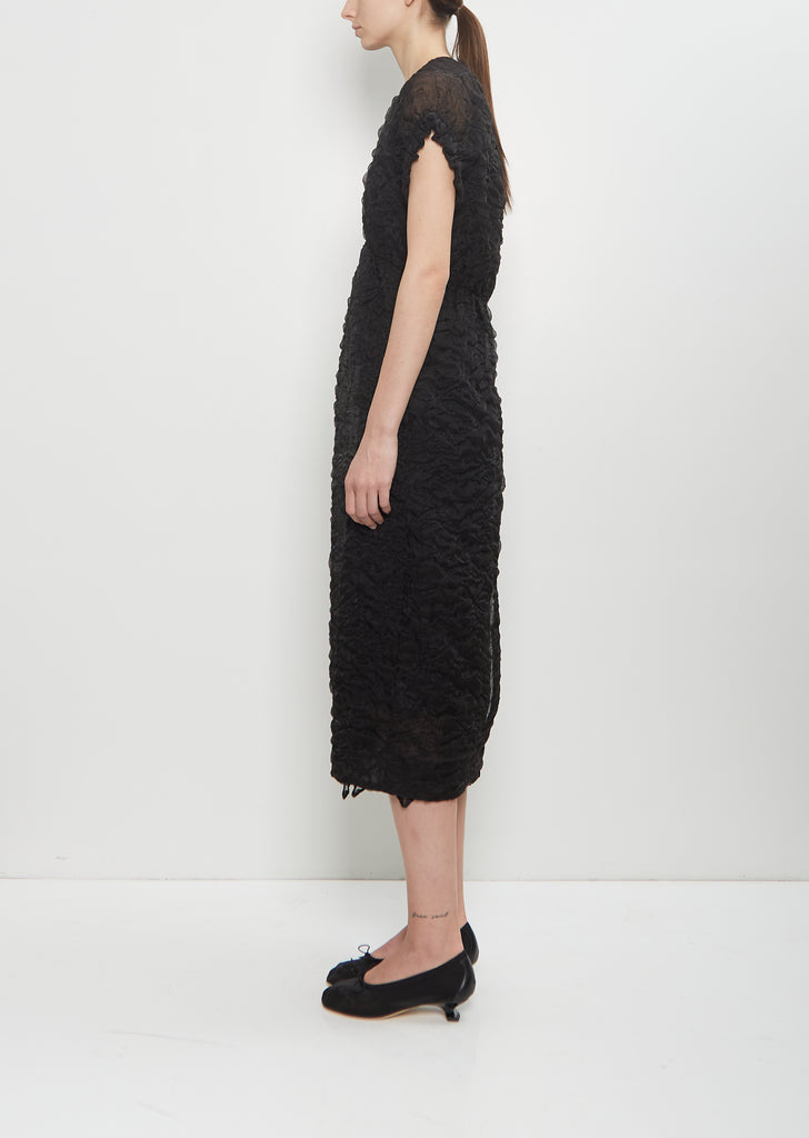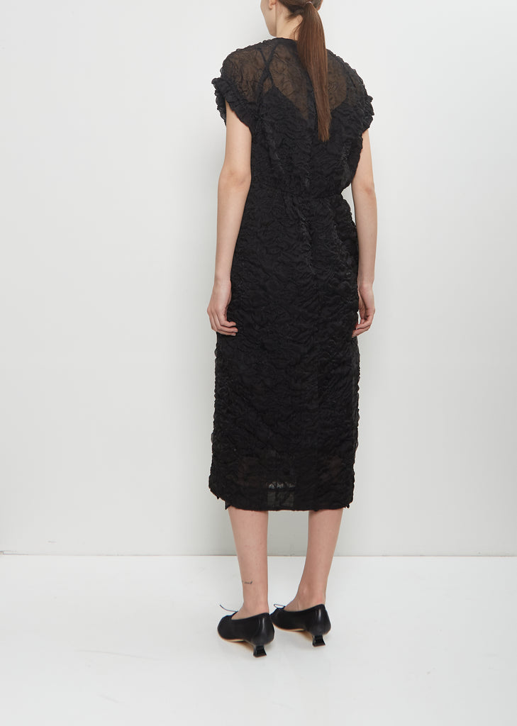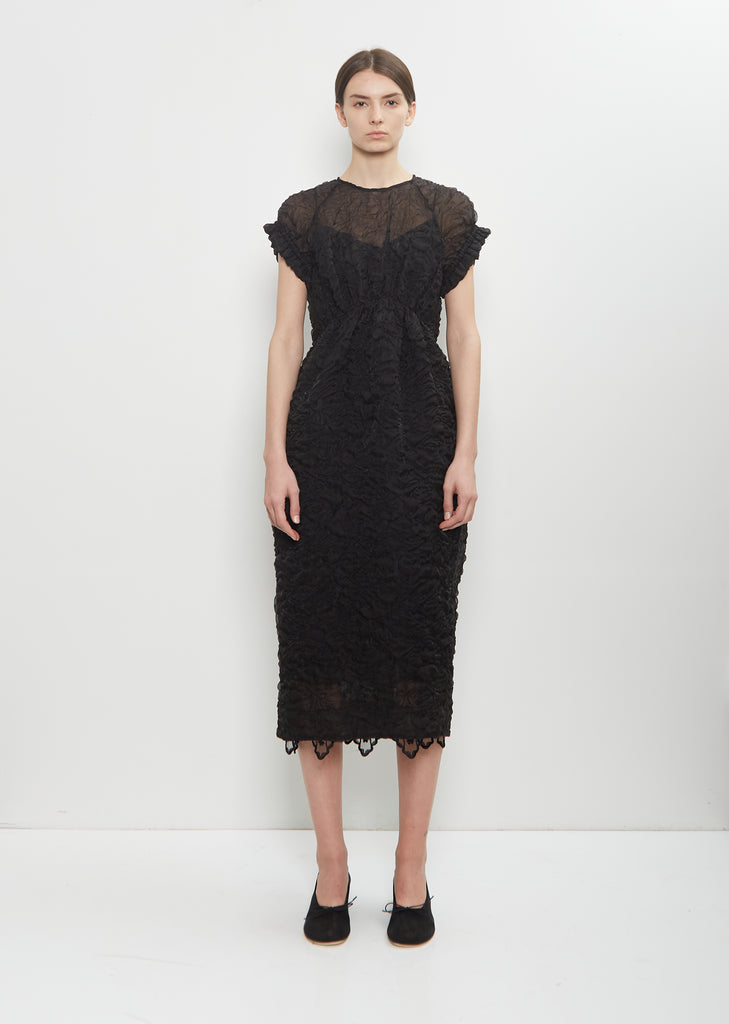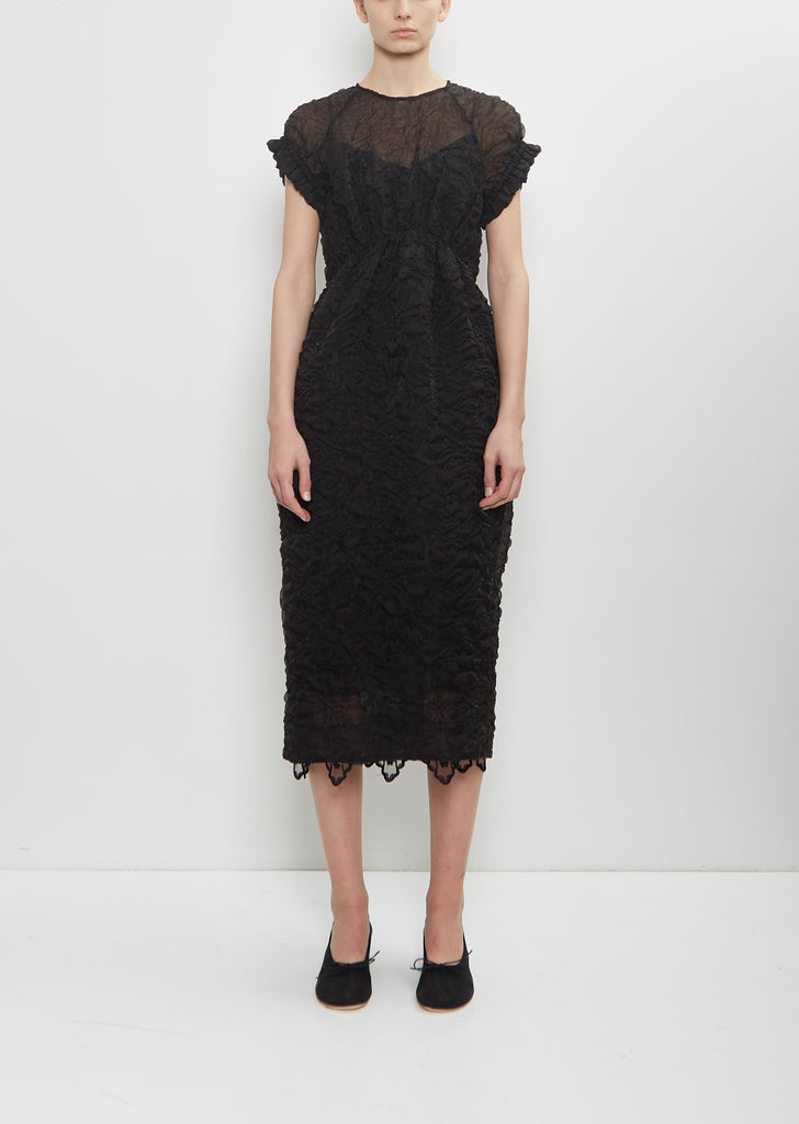 Simone Rocha black tulip silhouette dress with an empire waist and gathered cap raglan sleeves in textured sheer cotton and nylon blend matelassé fabric. Features a round neckline, side seam pockets and a concealed tonal zipper closure at back. Regular fit.