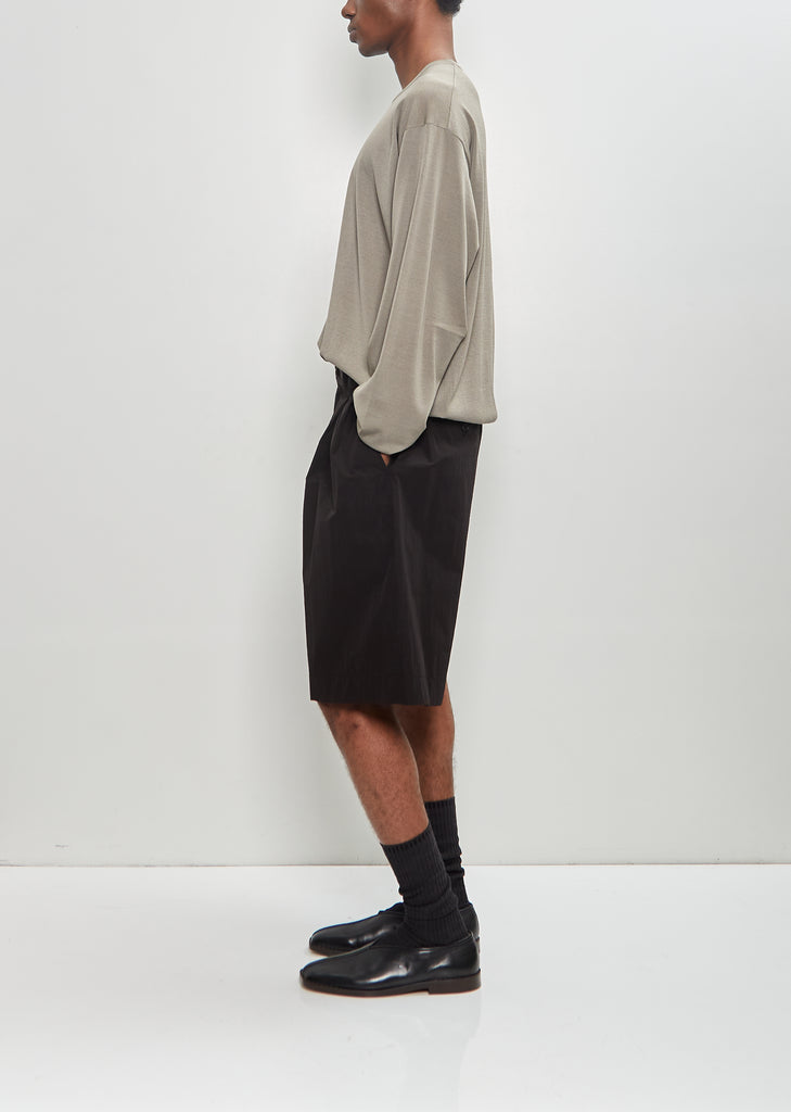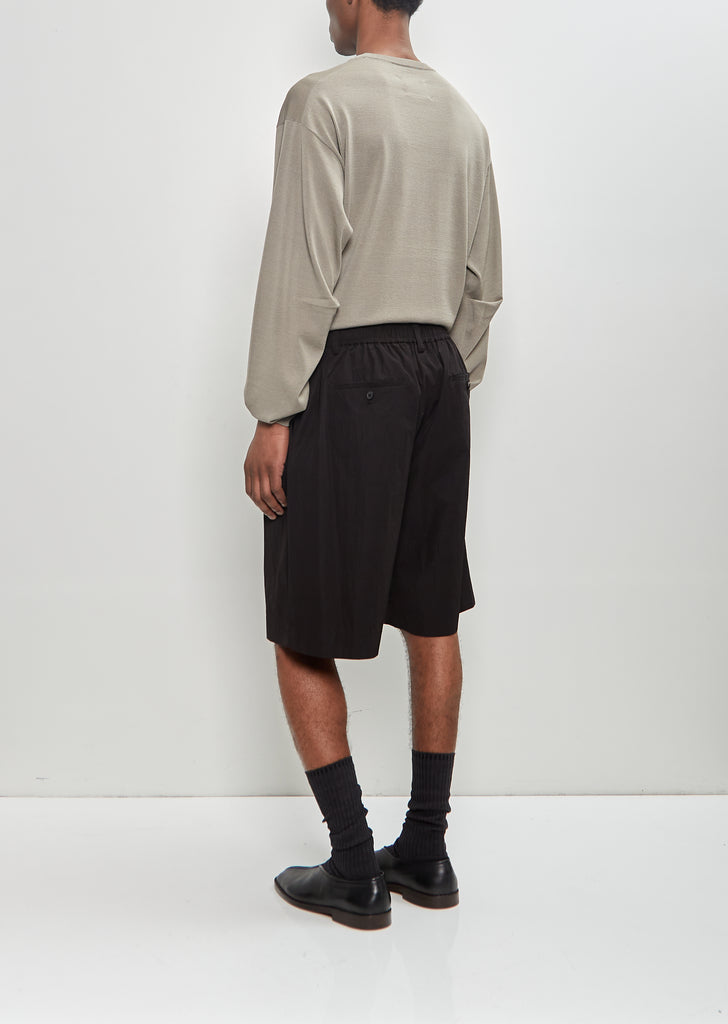 ssstein black wide shorts with two front pleats and an elasticated waist in a windproof nylon blend fabric. Features belt loops, angled side pockets, buttoned welt pockets at back, and button and zip-fly closure.