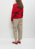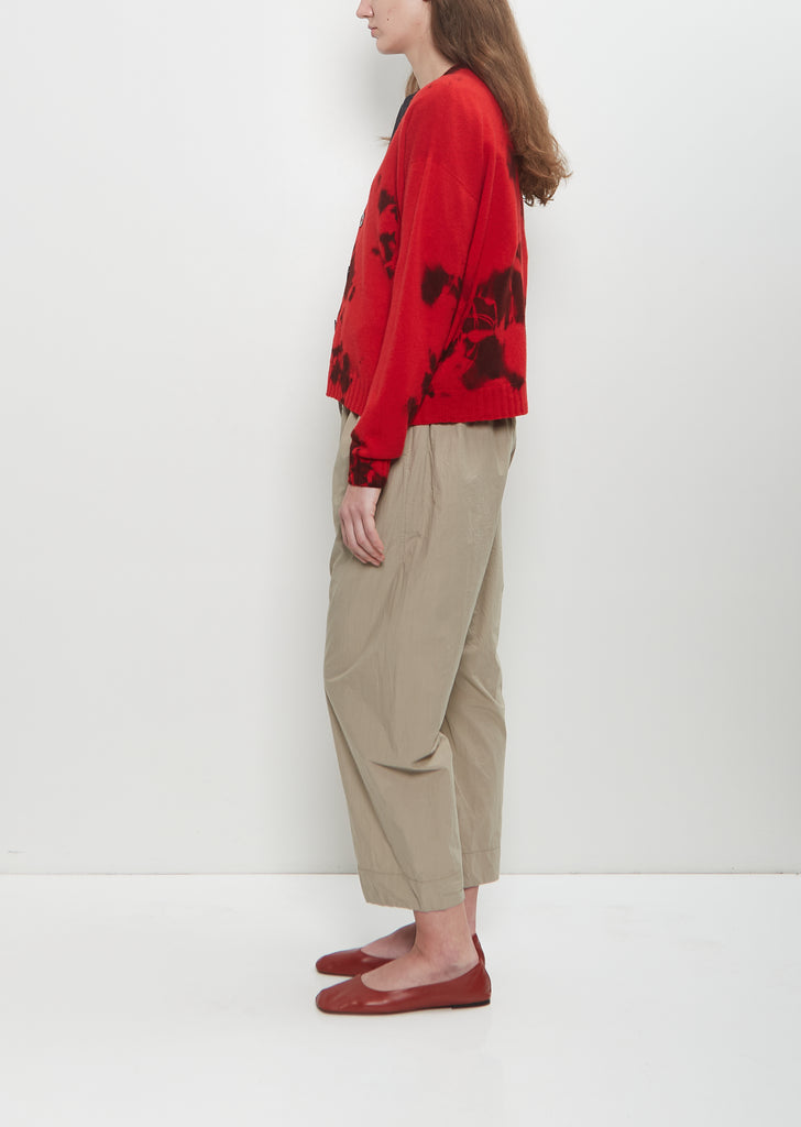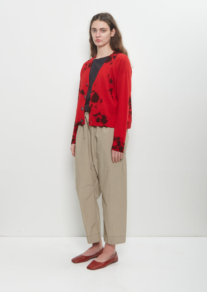 Suzusan bordeaux and red cropped cardigan with a V-neckline and mother-of-pearl button front in mid-weight pure cashmere knit with a traditional Shibori pattern. Features slightlly dropped shoulders, and rib trim finishings at neckline, cuffs, and hem. Regular fit.