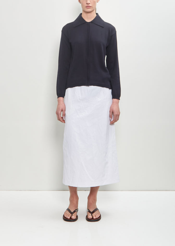 Ter et Bantine navy cardigan with a concealed zipper closure at front in lightweight cotton and acrylic blend knit. Features a spread collar, slightly dropped shoulders and rib trim finishings at cuffs and hem. Relaxed fit.