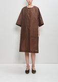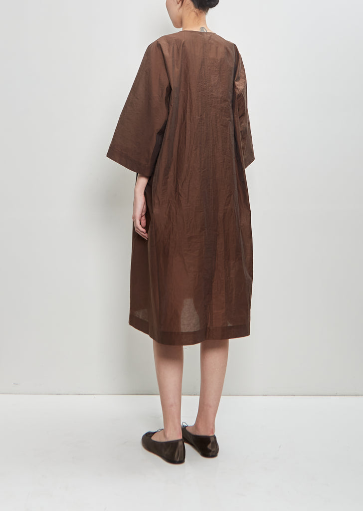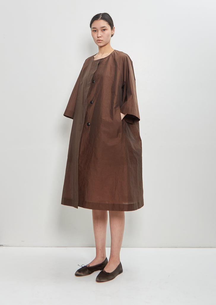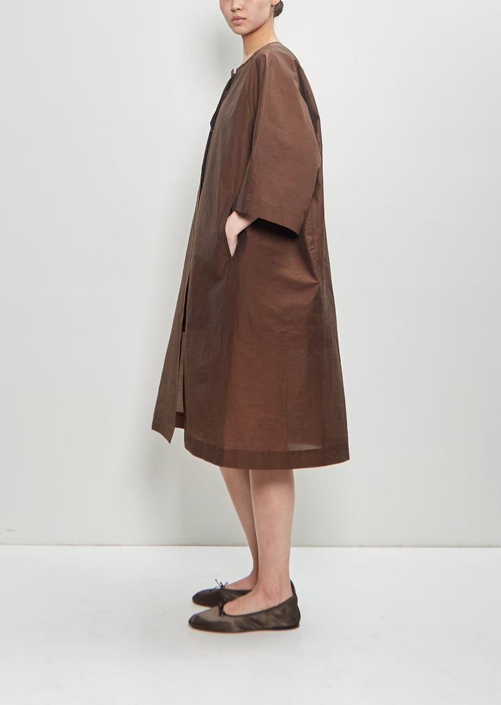 Ter et Bantine brown collarless coat with kimono sleeves and round neckline in cotton blend satin twill. Features angled pockets and concealed snap buttons closure at front.